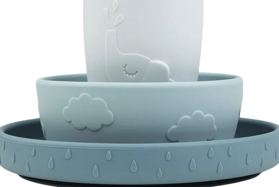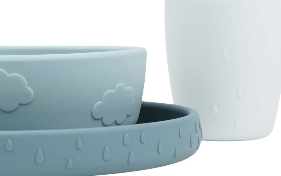 Spisesæt bestående af en tallerken, en skål og en minikop