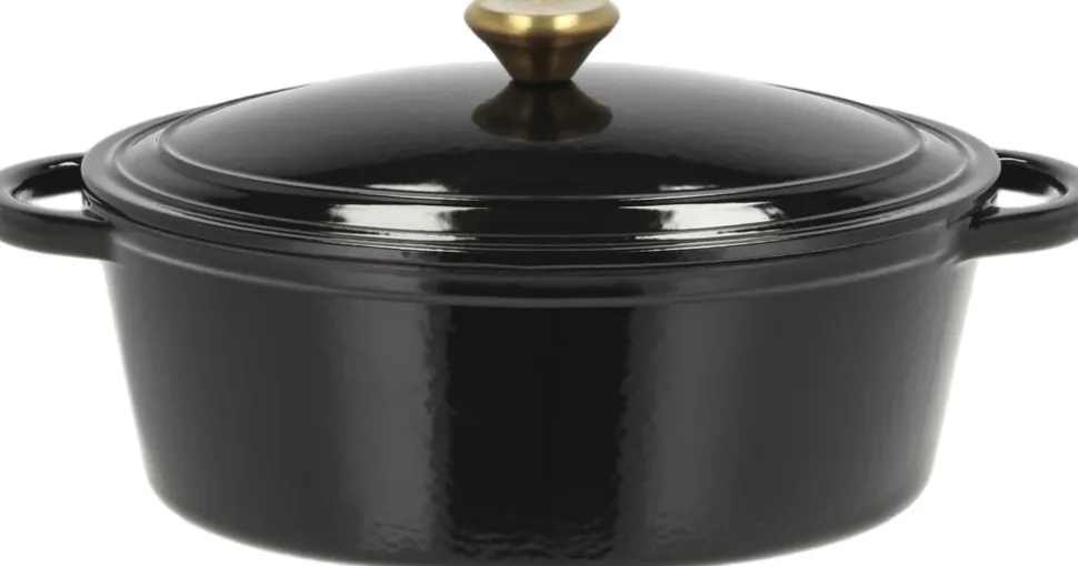 Oval støbejernsgryde, 4 liter. Garonne-serien fra Pillivuyt Gourmet er til dig, der elsker at stege ved en god, høj temperatur uanset om det er saftige steaks, simreretter eller en lynstegt wokret. Garonne-gryderne er fremstillet af klassisk støbejern, som holder godt på varmen og fordeler den jævnt i hele gryden. På glaskeramiske kogeplader anbefales det at løfte gryderne, når de flyttes det hjælper med at passe godt på kogepladen. Udvendigt har gryderne en blank, sort emalje som står i flot kontrast til en blank, lys inderside. Låget er designet med en praktisk drypfunktion, som opfanger damp fra maden og lader det dryppe tilbage i gryden. De flotte greb med børstet messinglook bliver varme, så husk grydelapperne. Kort fortalt: Klassisk støbejern med effektiv varmefordeling Krop fremstillet af 80 % genanvendt støbejern Blank sort emalje udvendig / hvid emalje indvendig Låg med drypfunktion Greb med børstet messinglook Velegnet til alle varmekilder også induktion Tåler redskaber af træ, plast eller silikone Tåler ovn op til 250 °C Håndopvask anbefales