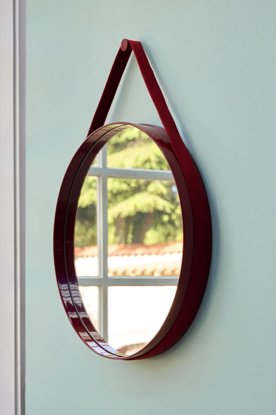 Med et funktionelt og minimalistisk Design har stropspejlet en diskret rille rundt om kanten, der indeholder en vævet strop til montering af spejlet på væggen. Strap Mirrors rene cirkulære Design er fremstillet i Pudder stål med en højglansfinish i forskellige farver, hvilket gør den ideel til ophængning i badeværelser, soveværelser og entréer.