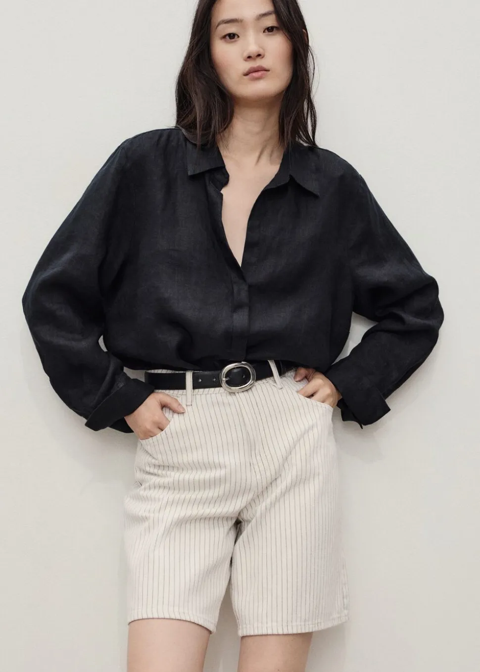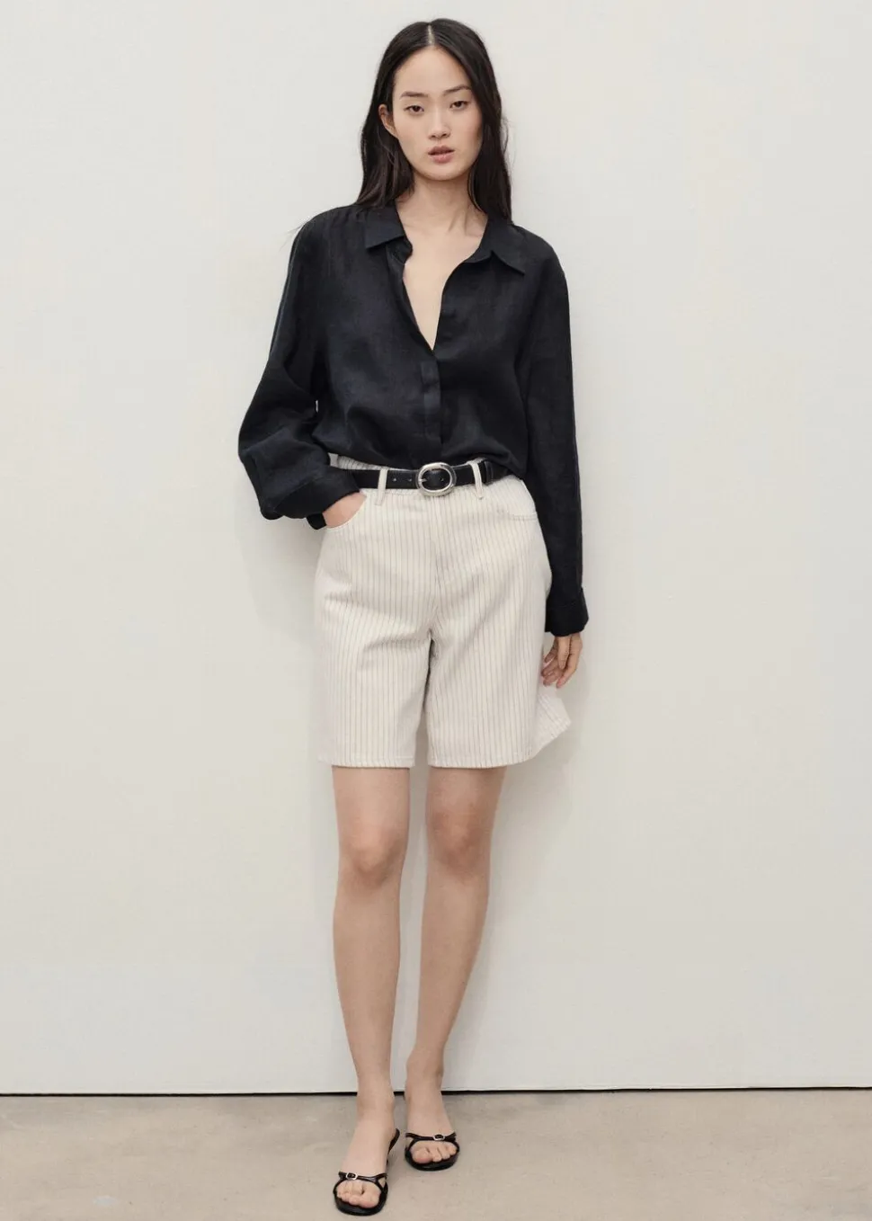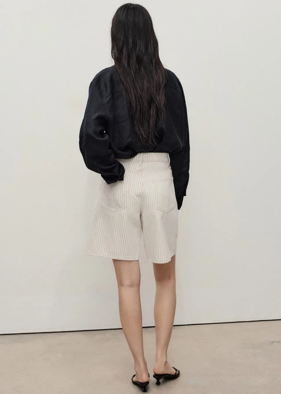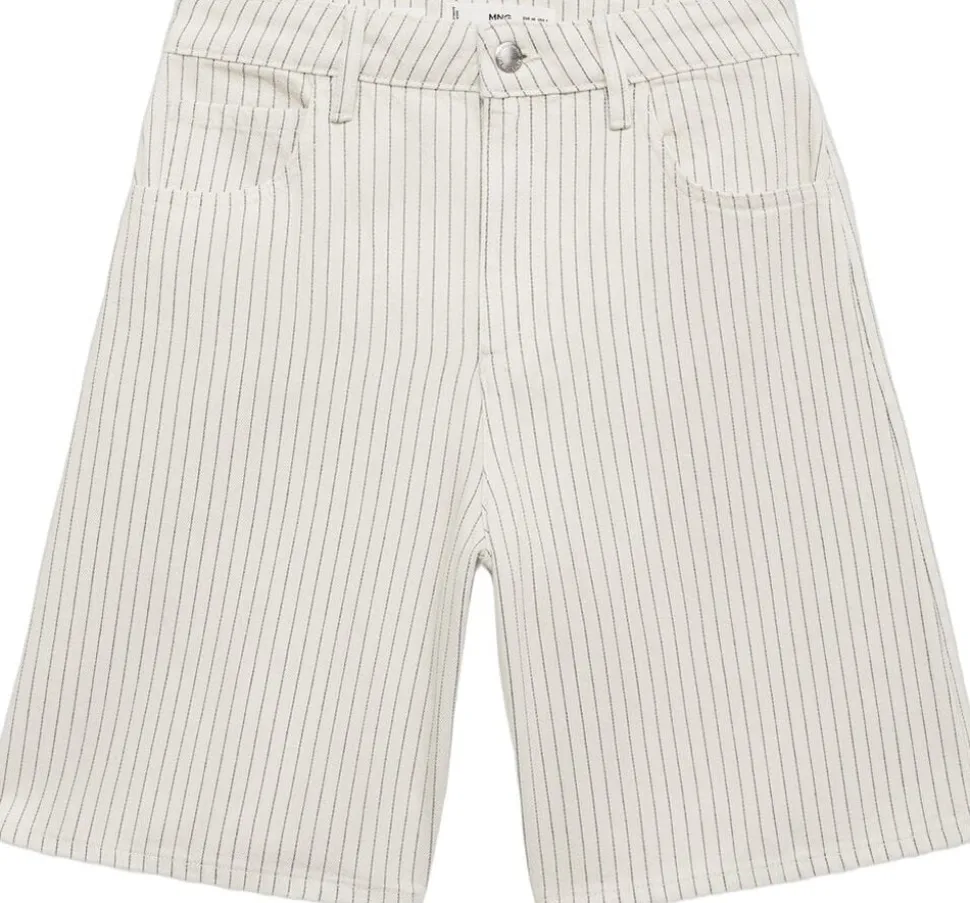Bomuldsstof i denimstil, lige Design, stribet tryk, høj talje, bæltestropper, fem lommer, lynlås foran og knaplukning.