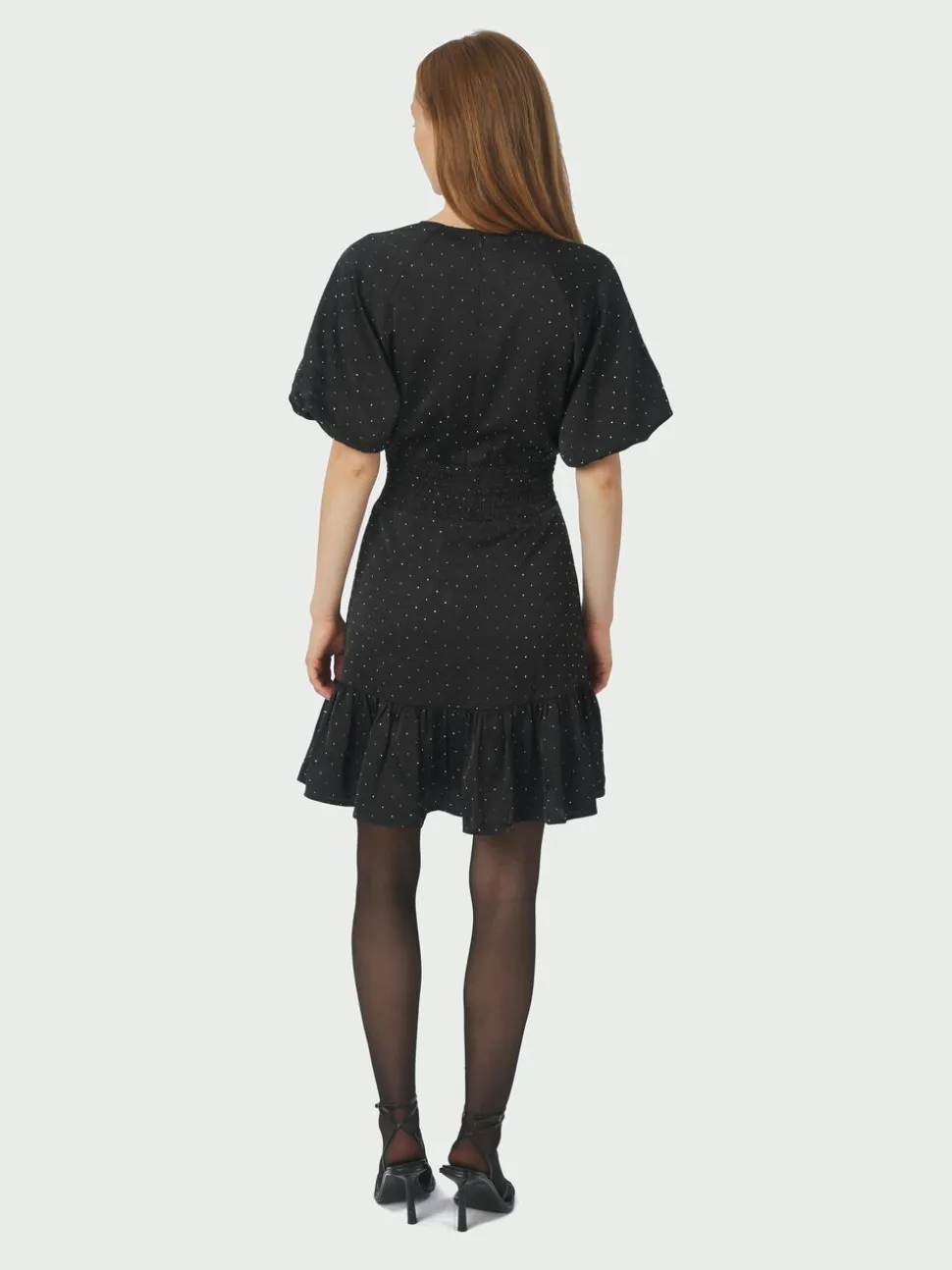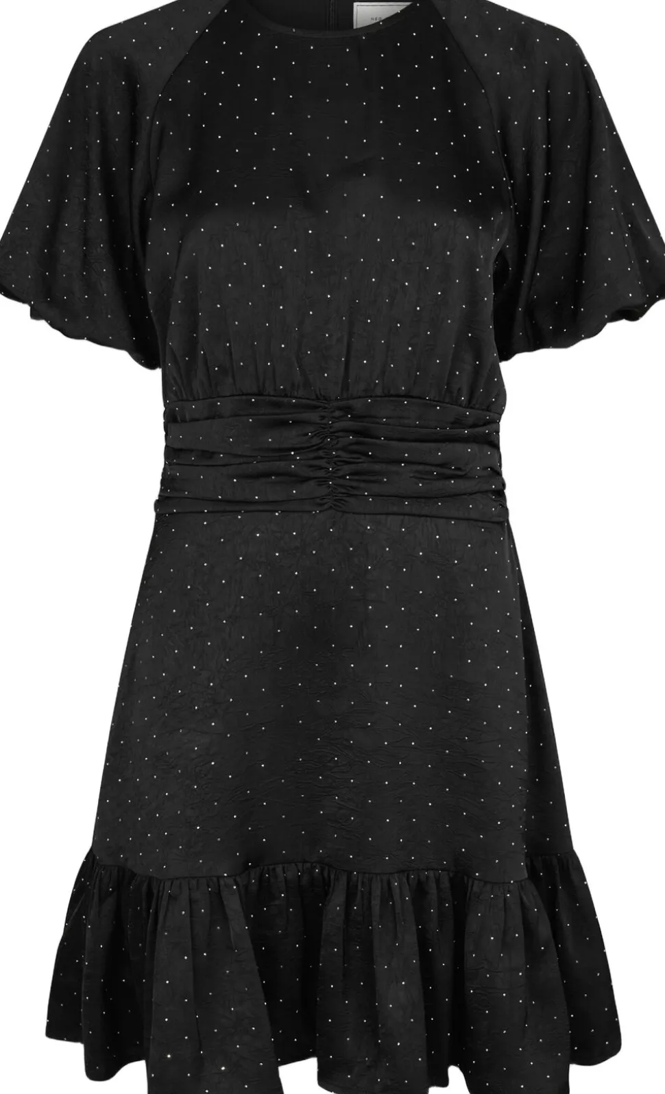 Kort kjole i satin med similisten. Kjolen har rund halsudskæring, korte ærmer med elastik og lukkes med en skjult lynlås i ryggen. Den fremhæver taljen med rynkede detaljer samt smock bagpå. Pasformen er almindelig. Modellen er iført størrelse 36.