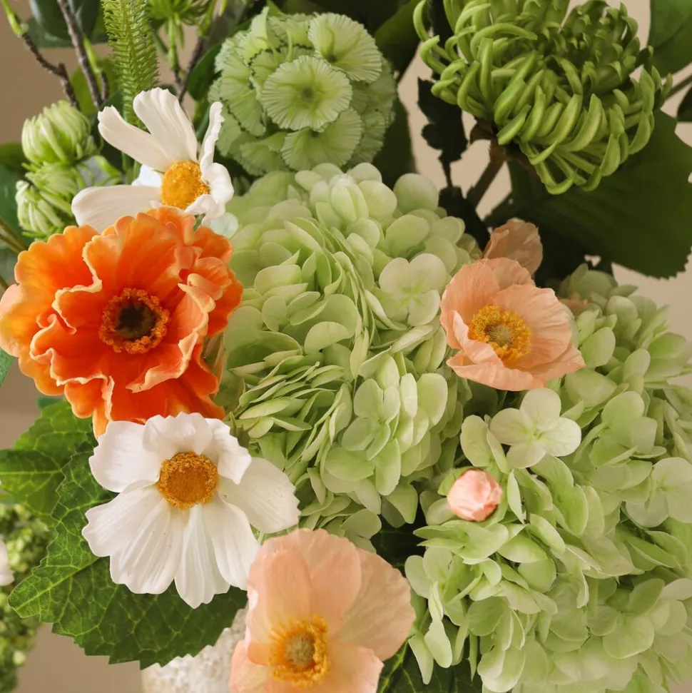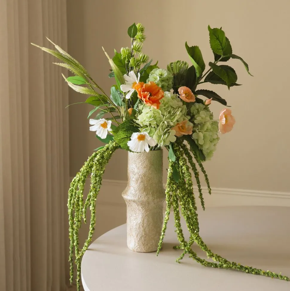 Denne buket byder p en forfriskende blanding af bløde grønne nuancer, varm koral og sarte hvide toner. De strukturerede blomster str i kontrast til faldende elementer og skaber en organisk komposition. Buketten indeholder i alt 12 stilke. Den mler op til 86 cm i højden, men alle stilke kan let bøjes og justeres for at opn den ønskede højde og form til enhver opsætning. Large Ceramic Earth Vase, som vist p billedet, mler 30,5 cm i højden og 10 cm i diameter.