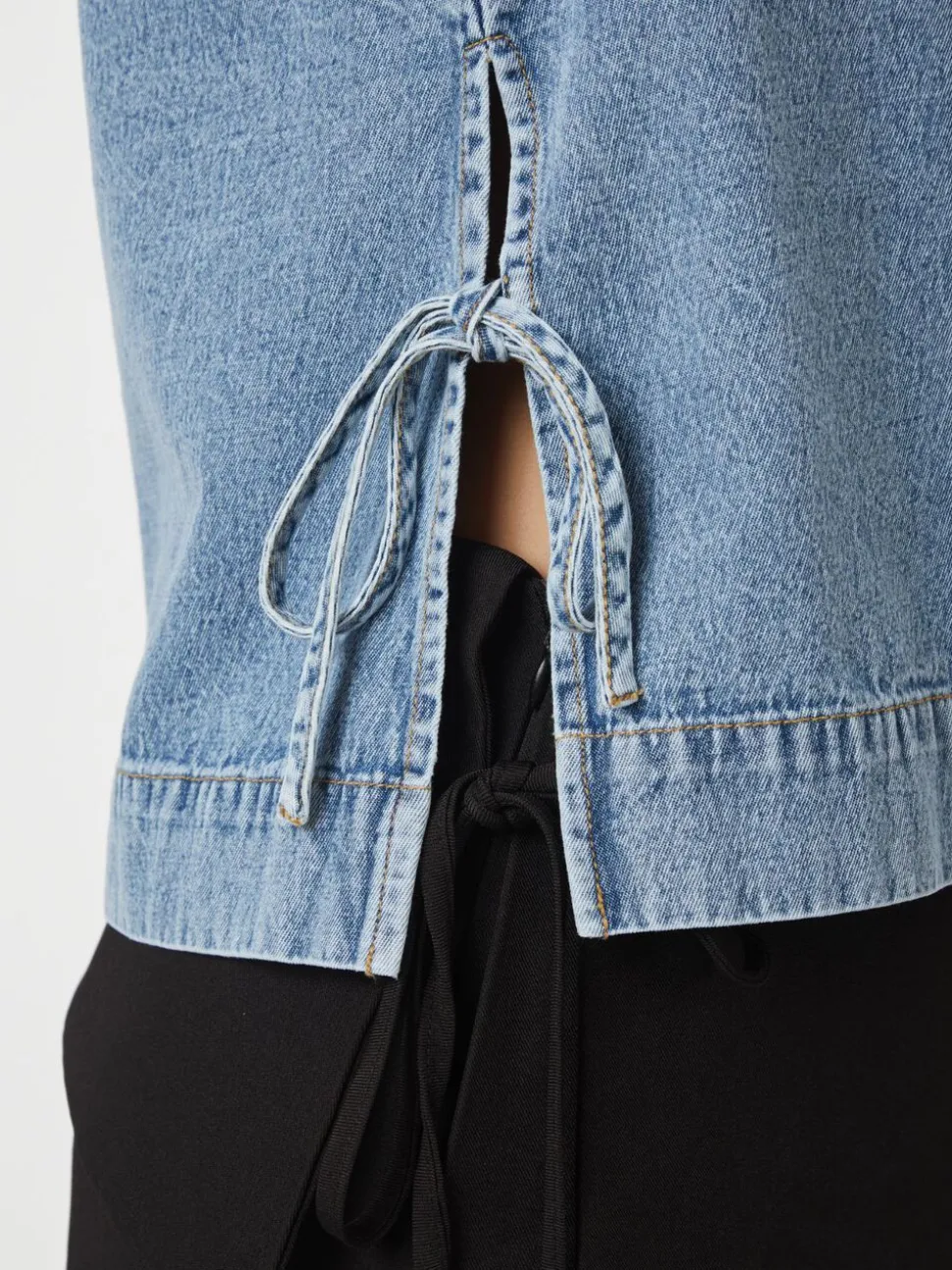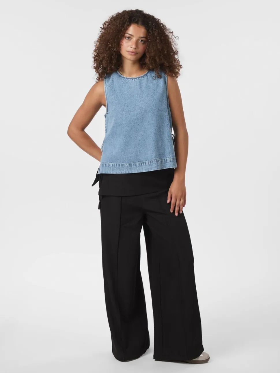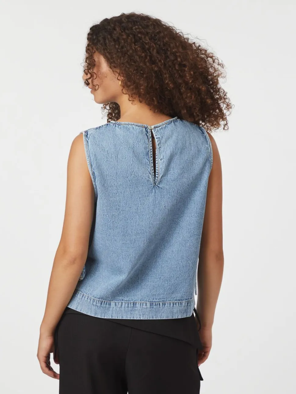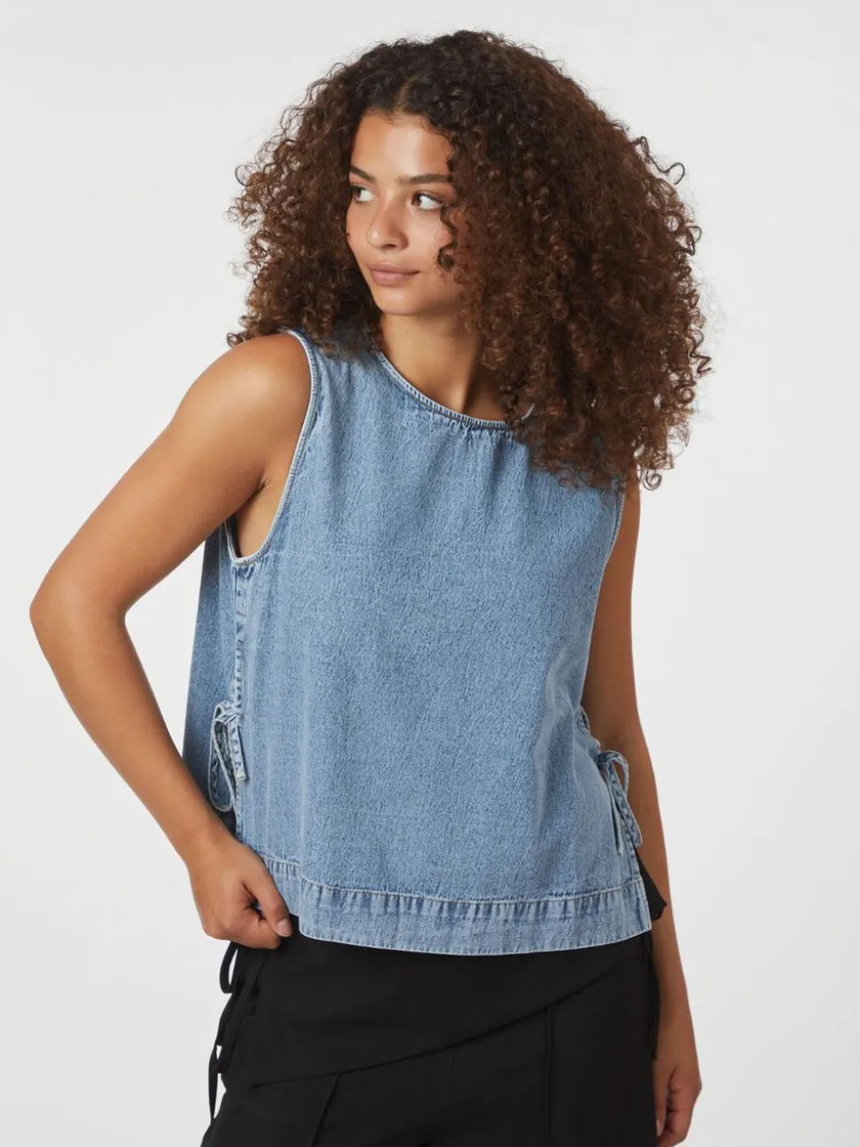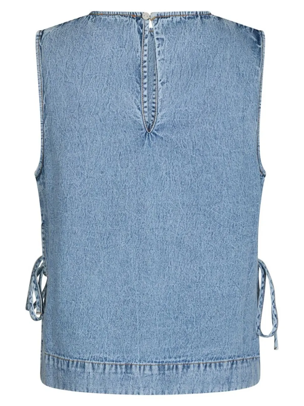 Kort denimtop uden ærmer. Toppen har en rund halsudskæring, slids med et justerbart bindebånd i siden og lukkes med en nøglehulslukning i ryggen. Den er lavet i en blød denimkvalitet i bomuld og har en løstsiddende pasform. Modellen er iført størrelse 36.