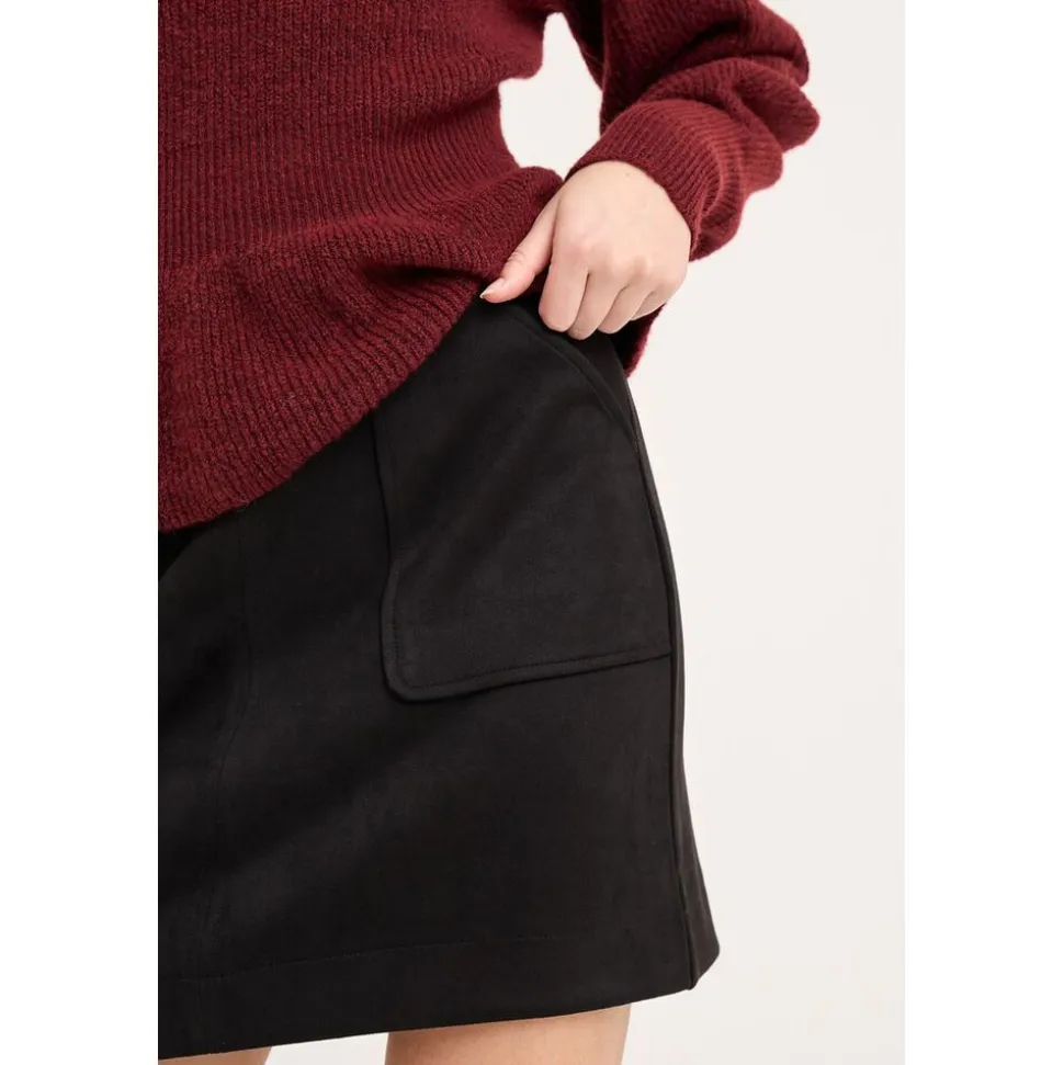 Tanni Skirt er en A-formet nederdel i imiteret ruskind med to store frontlommer. Nederdelen lukkes med lynlås bagpå. Nederdelen er normal i størrelsen. – A-form – Imiteret ruskind – Lynlåslukning