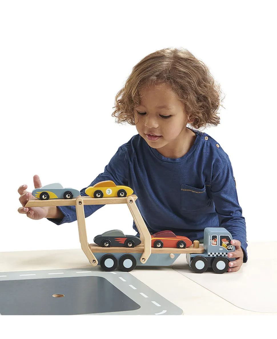 En solid biltransport i træ med aftagelig anhænger og bevægelig rampe, så de fire medfølgende racerbiler kan køre af og på.