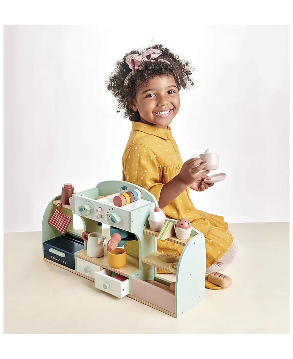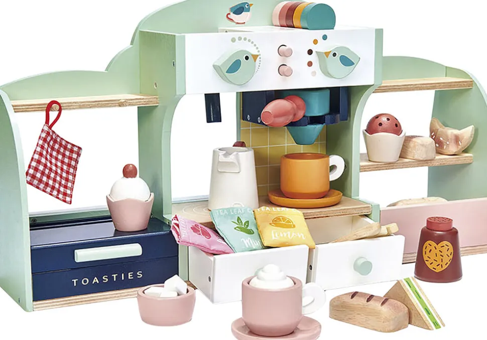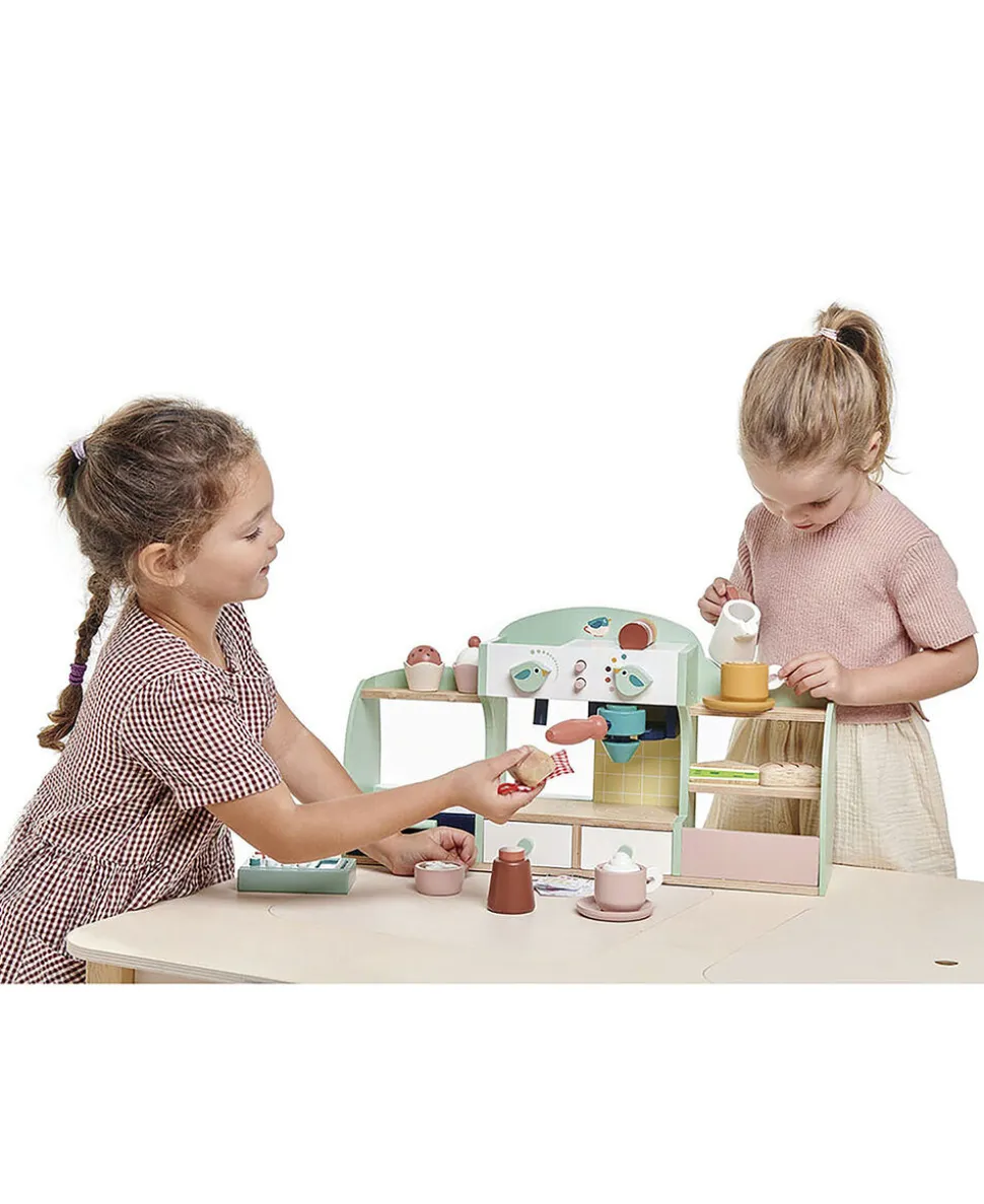 Kaffebar legecafé med masser af tilbehør, der inviterer til kreativ leg for 2 eller flere børn.