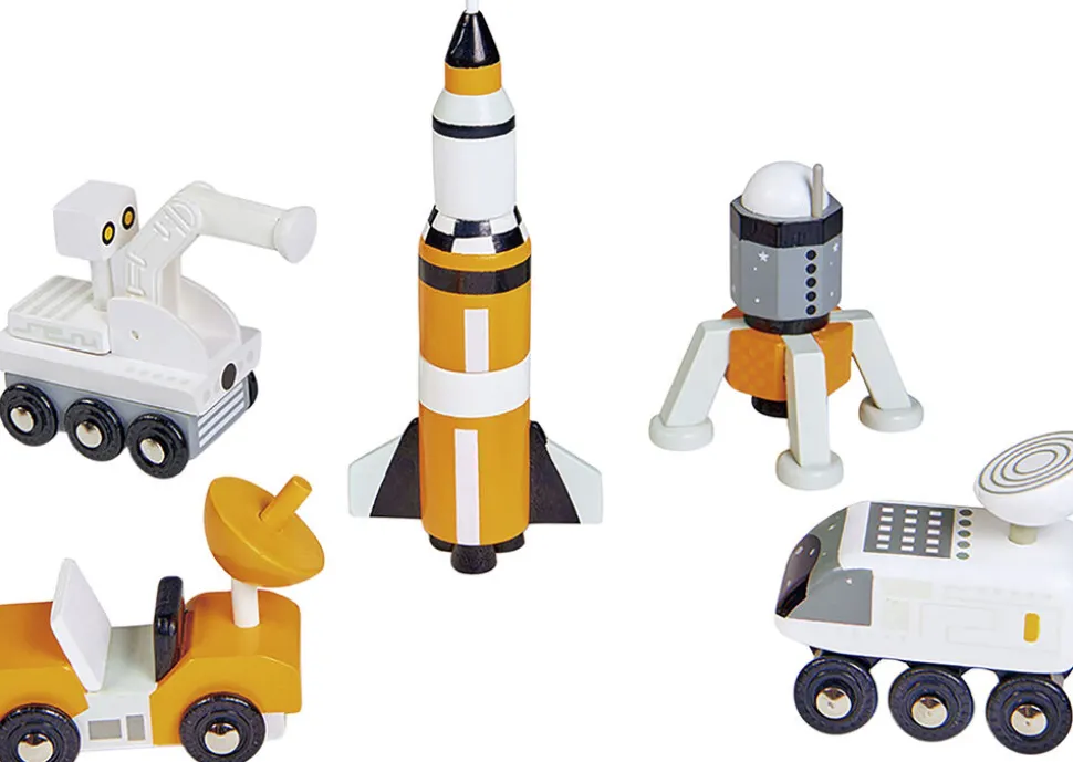 Indhold: 3-delt raket, månelandingskapsel, månekøretøj, besætningsrover, månesonde.