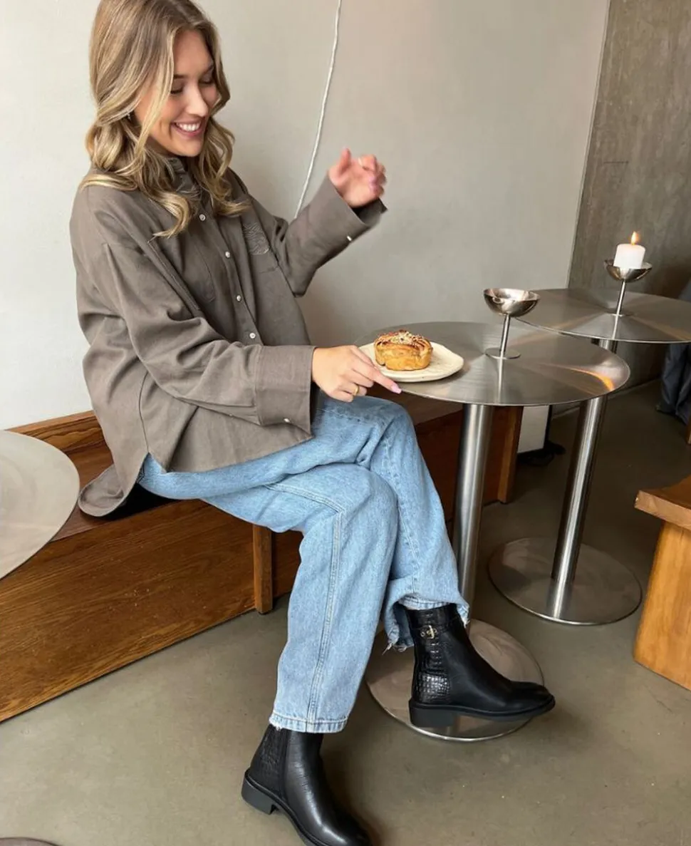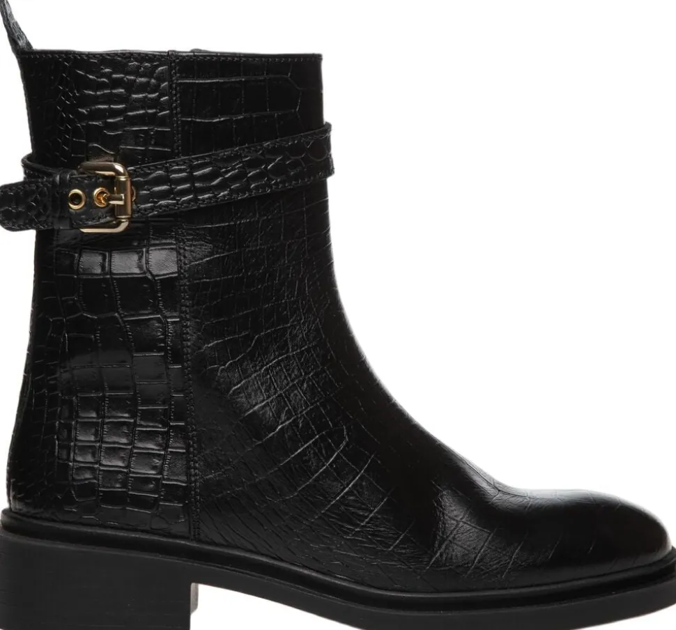 En stilfuld ankelstøvle i præget croco-skind med et eksklusivt og moderne udtryk. Det dekorative spænde i forgyldt guld tilfører et raffineret twist, som gør støvlen ekstra elegant. Modellen har lynlås på indersiden, der sikrer nem af- og påtagning, og den solide TR-sål giver god komfort.
