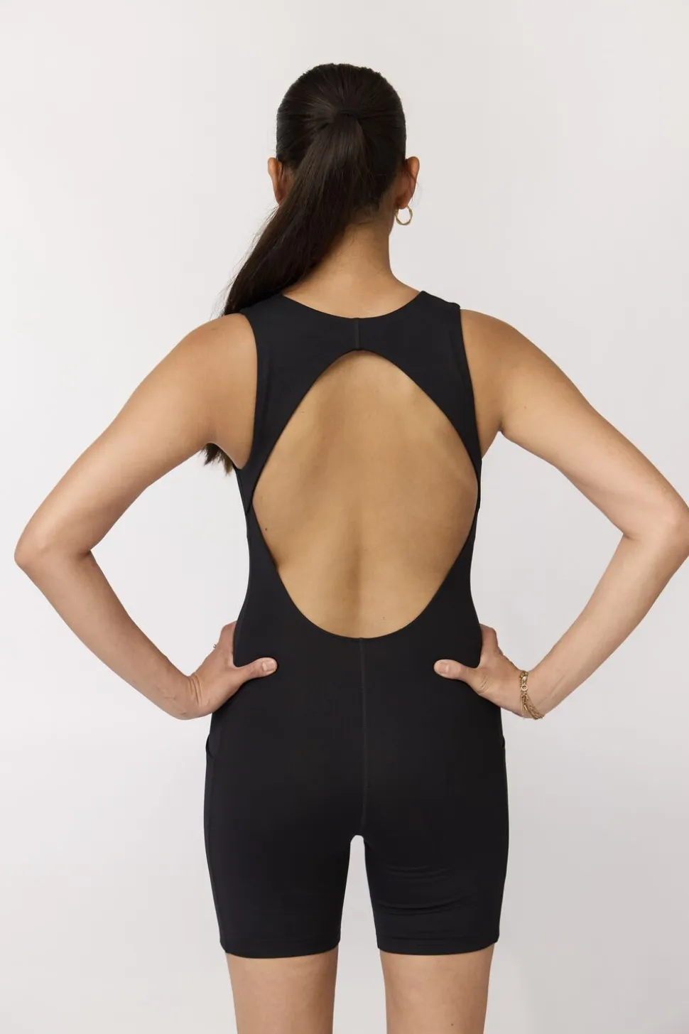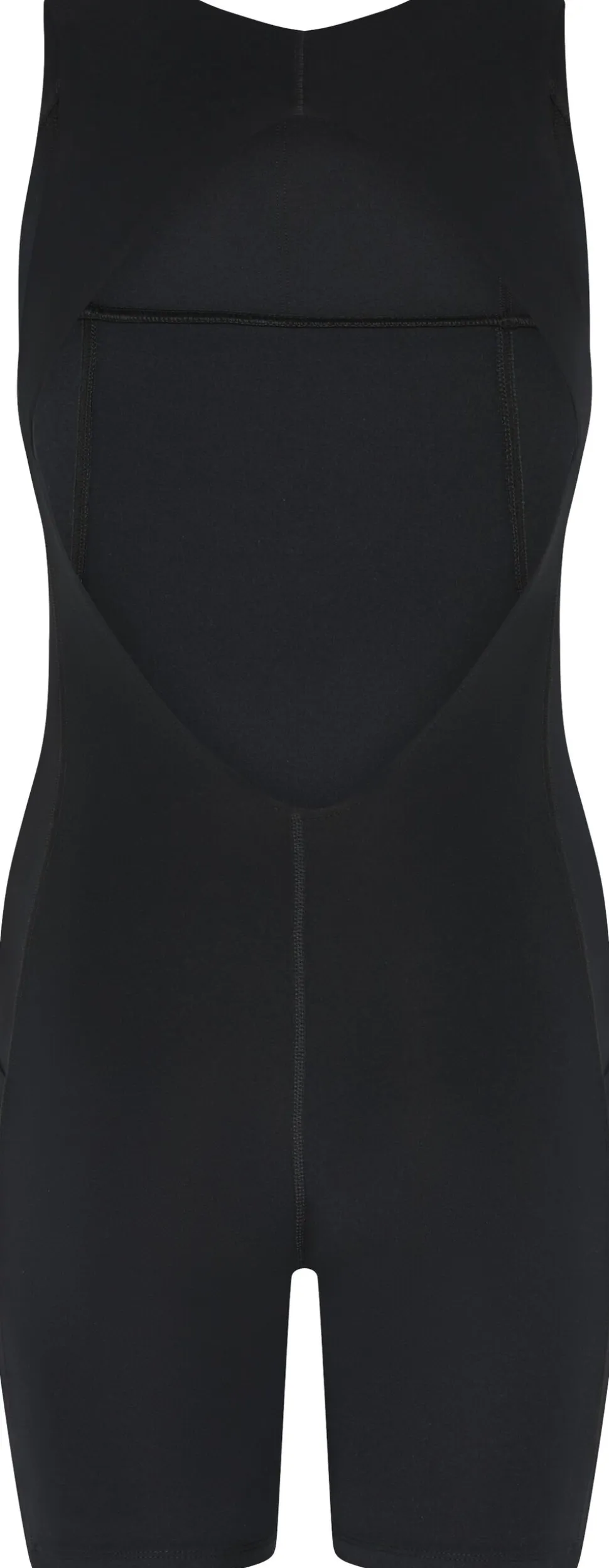 Tina unitard med firkantet halsudskæring og indersøm. Aftagelige puder og sidelommer på shortsene