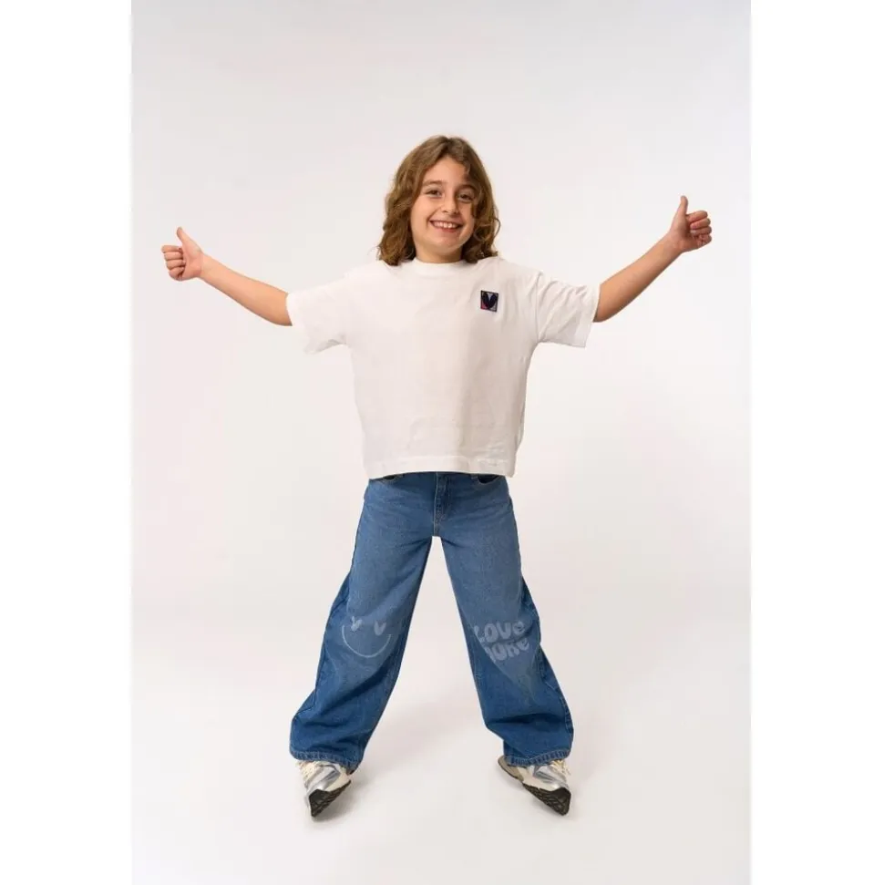 Stilfulde pigebukser med vidde i benene og et glad ansigt på det ene ben samt teksten “Love more” på det andet. I en klassisk mellemblå denimfarve og med det søde print, har bukserne masser af charme og stil. Brug disse fine og charmerende jeans fra THE NEW som en del af et afslappet hverdagsoutfit, eller kombiner dem med en flot top til fester og særlige lejligheder. – Løs pasform med brede ben (wide-leg). – Print på benene. – Justerbar elastik i taljen, så omkredsen kan tilpasses efter behov. – Funktionelle lommer foran og bagpå. – Bæltestropper.