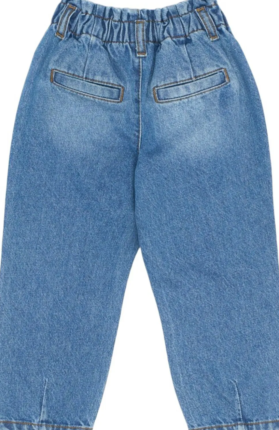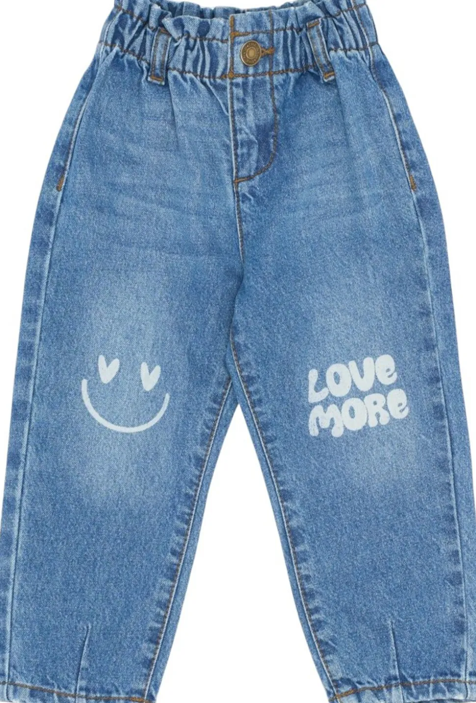 Disse lyseblå denim bukser fra THE NEW siblings er både stilfulde og komfortable. Bukserne har både for- og baglommer, elastisk talje, en praktisk knappelukning og bæltestropper. Der er en smiley på det ene ben og teksten “Love More” på det andet. Printet på benene er unikt, og gør dem perfekte til både hverdag og fest. – Lyseblå denim. – For- og baglommer. – Knappelukning. – Elastisk linning. – Bæltestropper. – Smiley print og skrift “Love More”.