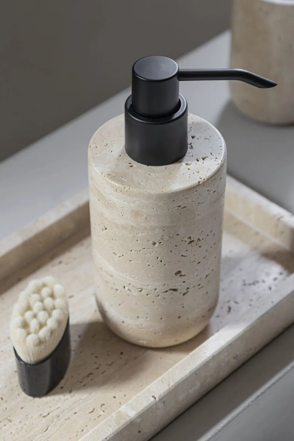 Den høje TRAVERTIN-dispenser fra Mette Ditmer kombinerer et minimalistisk design med travertinens naturlige karakter. Med sine unikke mønstre og rå tekstur tilfører dispenseren en varm og organisk detalje til badeværelset eller køkkenet. Materialets robuste kvalitet og tidløse æstetik gør dispenseren til en praktisk og elegant løsning til håndsæbe, opvaskemiddel eller lotion.Dispenseren har en sort ABS-pumpe og kan kombineres med andre produkter i TRAVERTIN-serien for et strømlinet look.
