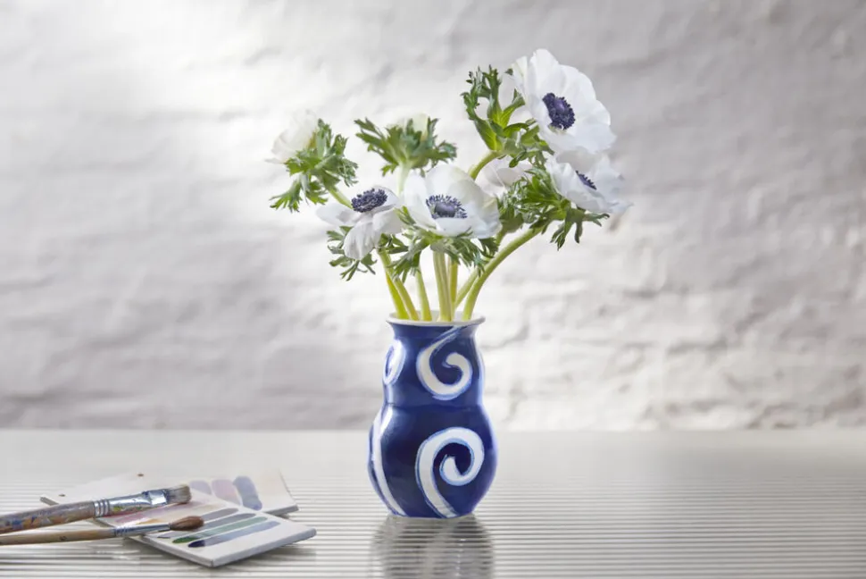 Med vaseserien Tulle hylder Kähler nostalgien og romantikken med håndmalede dekorationer inspireret af de ældre Kähler-vaser. Den skulpturelle vase i mellemstørrelsen på 12,5 cm i højden har en mørkeblå bund, hvor der ovenpå er malet hvide snørkler, der efterfølgende er glaseret. Her er penselstrøgene tydelige, organiske og naturlige og er med til at give vasen et unikt udtryk. Vasen er skabt i et lækkert autentisk og kunstnerisk udtryk i en moderne kontekst i en lille størrelse, hvor der til gengæld er blevet leget med at skabe ekstra dybde og liv gennem dybe og fyldige glasurer med oprindelse i det gamle Käh-ler-værksted. Det er en af dygtigste malepiger fra dengang, Tulle Emborg, der nu får æren af at lægge navn til Tulle-serien. Og du kan både se og føle, at der er et menneske bag, der har gjort sig umage med at male vasen i hånden for at skabe et ekspressivt og levende udtryk. I dekorationerne fornemmer du også tydeligt den kunstneriske forståelse og de intuitive bevægelser, der gør Tulle-vasen til et lille kunst-værk i sig selv og tilfører den en helt særlig nostalgisk autenticitet. De runde former skaber en skulpturel og grafisk silhuet, så vasen også sagtens kan stå alene uden blomster som en del af en både romantisk og moderne indretning.
