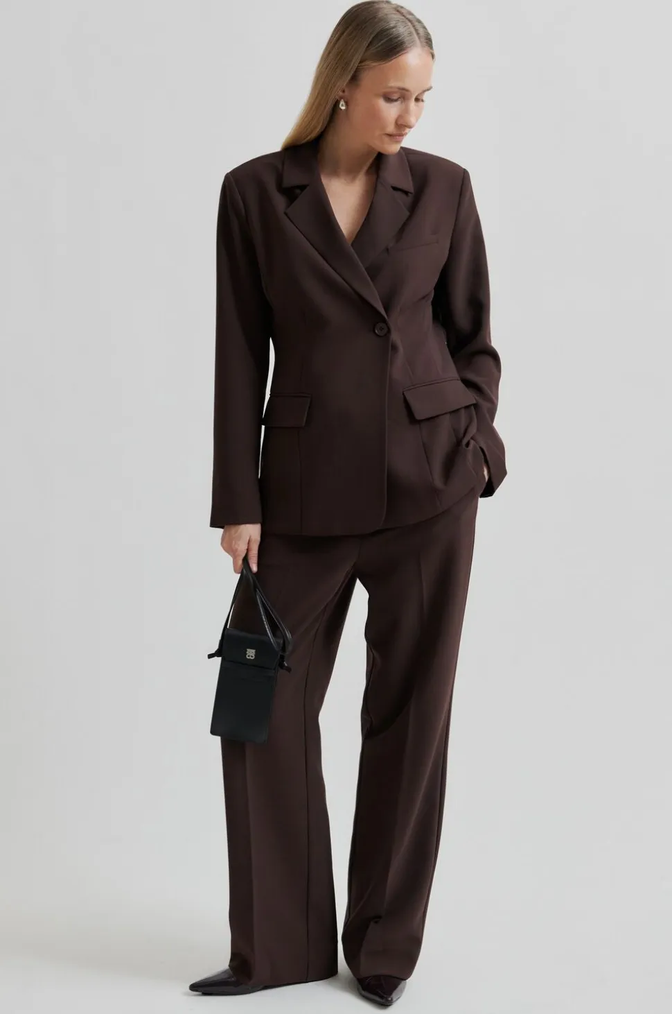Second Female telefontaske i læder. Med justerbar skulderrem og klap foran med læderstrop til sikker fastgørelse. Sølvfarvet logodetalje foran.