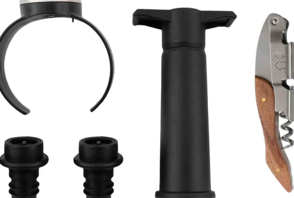 Komplet vinsæt i fem dele i rustfrit stål. Indeholder proptrækker, prop, hælder og folieskærer – alt samlet til den vininteresserede.