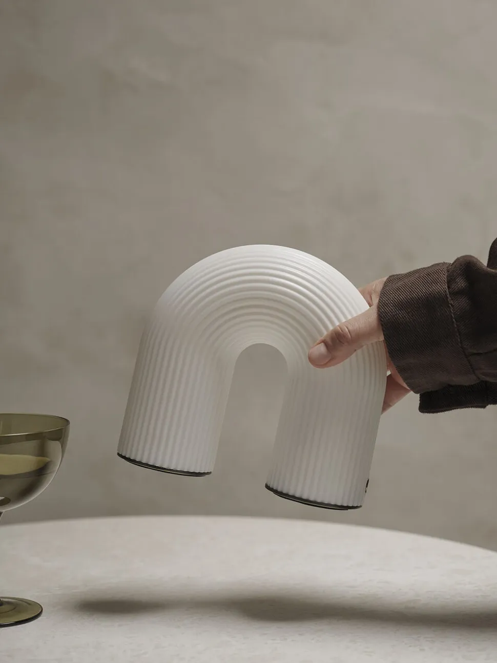 Med sin skulpturelle bue, der minder om antikke søjler, afspejler Vuelta Bærbare Lampe Vuelta seriens karakteristiske stil. Denne kompakte belysningsløsning er designet med tanke på at den kan løftes og skiller sig ud ved sit håndværk og sin holdbare plastkonstruktion, hvilket gør den til et usædvanligt alsidigt produkt. Lampen forener funktionalitet og design og har en LED-lyskilde, der udsender et blødt, diffust lys, og en justerbar lysdæmper, der giver ultimativ kontrol over stemningen. Denne bærbare lampe er en mangesidig tilføjelse til ethvert miljø
