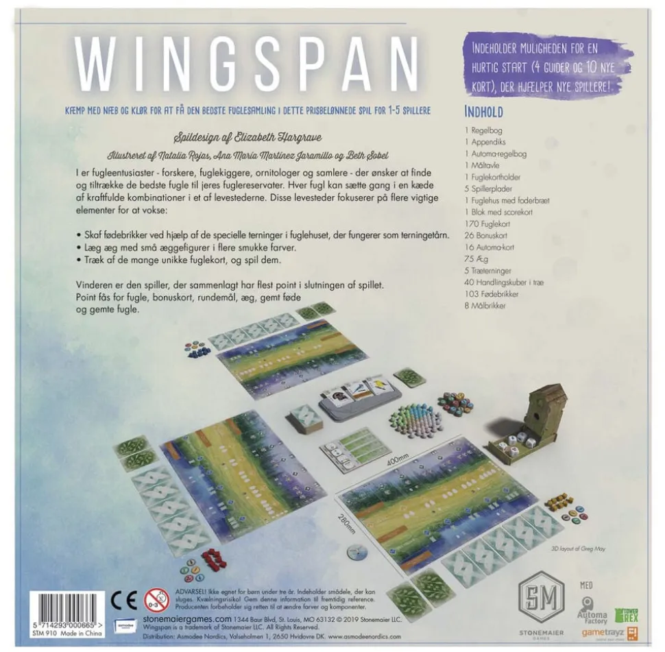I er fugleentusiaster – forskere, fuglekiggere, ornitologer og samlere – der ønsker at finde og tiltrække de bedste fugle til jeres fuglereservater Hver fugl kan sætte gang i en kæde af kraftfulde kombinationer i et af levestederne Disse levesteder fokuserer på flere vigtige elementer for at vokse: ? Skaf fødebrikker ved hjælp af de specielle terninger i fuglehuset, der fungerer som terningetårn ? Læg æg med små æggefigurer i flere smukke farver ? Træk af de mange unikke fuglekort, og spil dem Vinderen er den spiller, der sammenlagt har flest point i slutningen af spillet Point fås for fugle, bonuskort, rundemål, æg, gemt føde og gemte fugle
