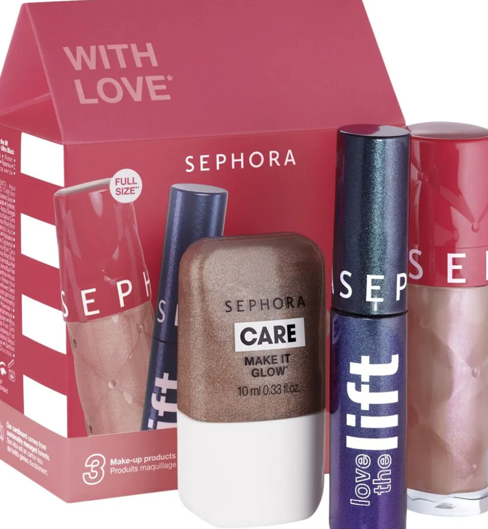 Forelsk dig i dette yndige sæt med 3 makeup-essentials til din teint, mund og øjne. Start med at løfte dit blik med den uundværlige LOVE THE LIFT-mascara i et uimodståeligt miniformat, som du kan tage med overalt. Boost derefter din teints udstråling med MAKE IT GLOW flydende highlighter. En enkelt dråbe er nok til at give en meget perlemorsagtig finish. Den sidste detalje? Få øjeblikkelig volumen med Outrageous Intense, den krydrede lip plumper (1), der er tilsat chiliekstrakt. En trio til at (forkæle dig selv med) pifte din makeup-rutine op.
