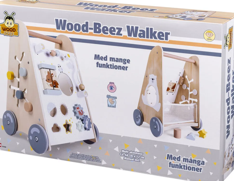 Aktivitetsgåvogn i træ Med mange forskellige aktiviteter.