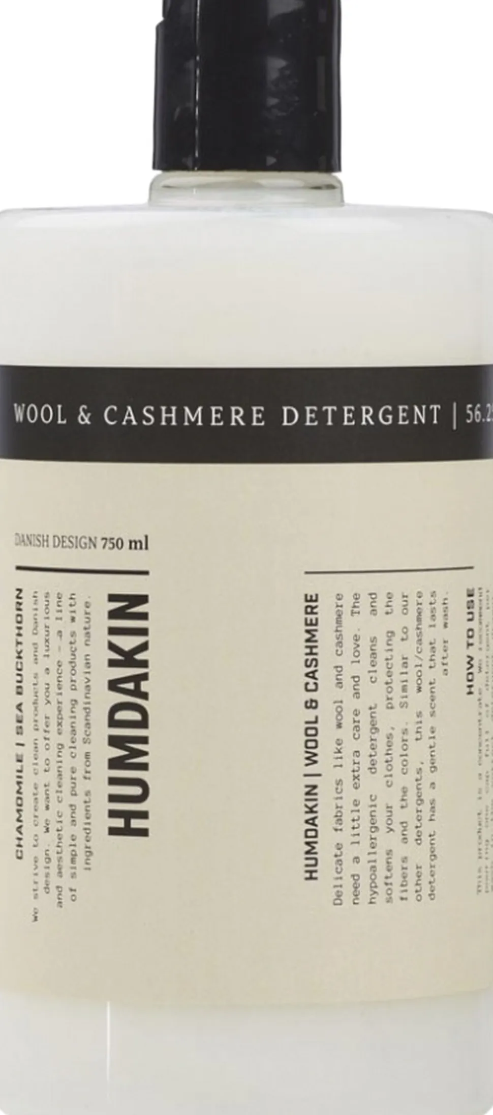 Laundry soap for wool and cashmere.The hypoallergenic wool and cashmere detergent cleans and softens your clothes. Not only is this detergent allergy-friendly, it also protects the natural fibers found in wool and cashmere. Treat your delicate fabrics with Humdakin’s wool and cashmere laundry soap, which can be used in the machine or when hand washing. Enjoy the fresh and mild scent of sea buckthorn and chamomile left after wash.DIRECTIONS FOR USEThis product is a concentrate. Always use as directed.When dosing the detergent, think about the environment – do not overuse. Excessive use does not make the clothes any softer and is harmful to the environment.The recommended dosage is one capful, or 30 ml, per wash.