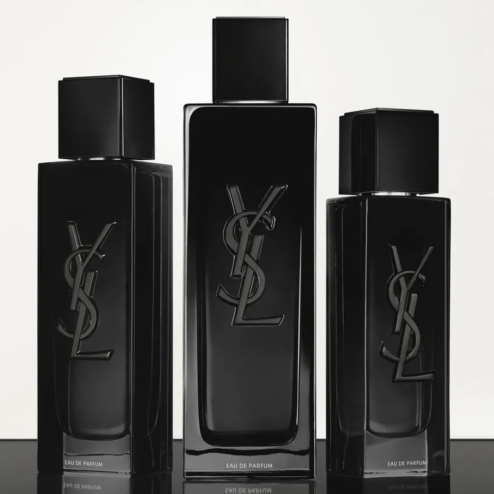 Silhuetten af YSL-silhuet i en flakon. Skinnende. Flydende. En sortlakeret monolit i nuancer, hvor du kan se dig selv. I hjertet, indkapslet i glasset, er det ikoniske YSL Cassandre-logo.