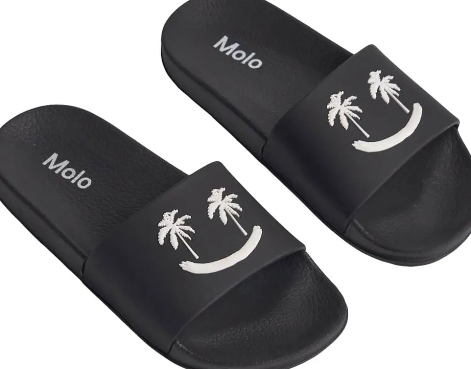 Badesandaler med bred fodrem og formstøbt indersål. Disse sandaler er vandafvisende og ideelle til både poolen og stranden. Fodremmen prydes af et smilende ansigt med palmeøjne.
