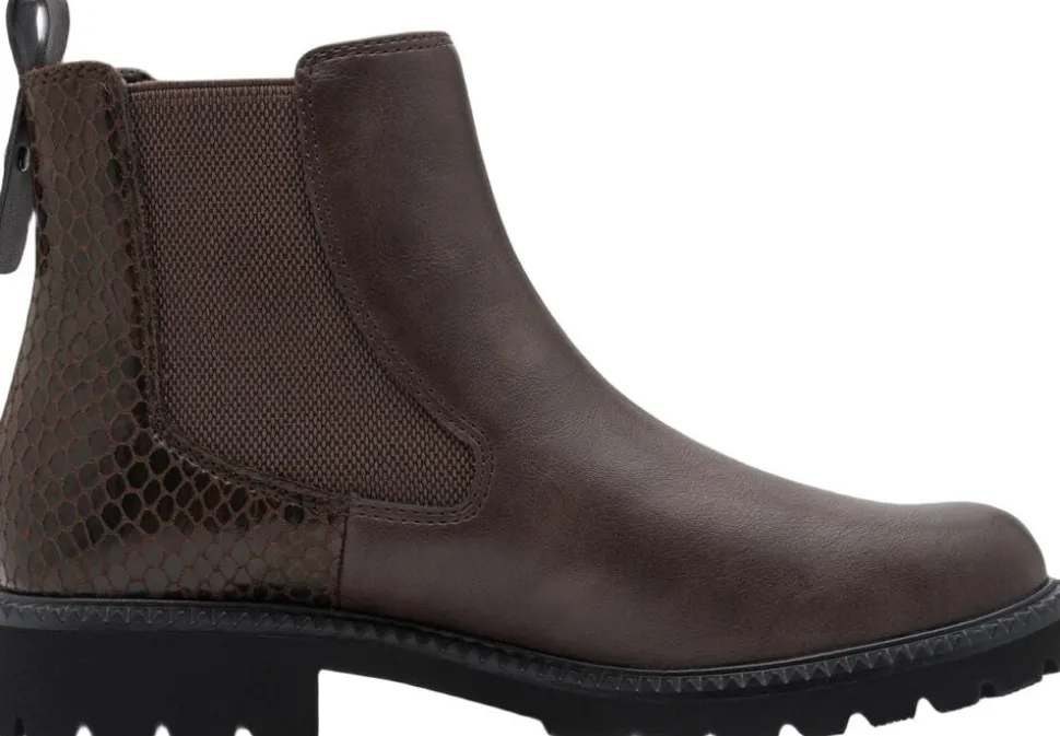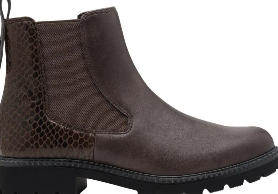 Flad enkel lavskaftet chelseas i mørkebrunt skind look med snake effekt på hælen. Skafthøjden 13 cm. Sålen er profil letvægt sål.