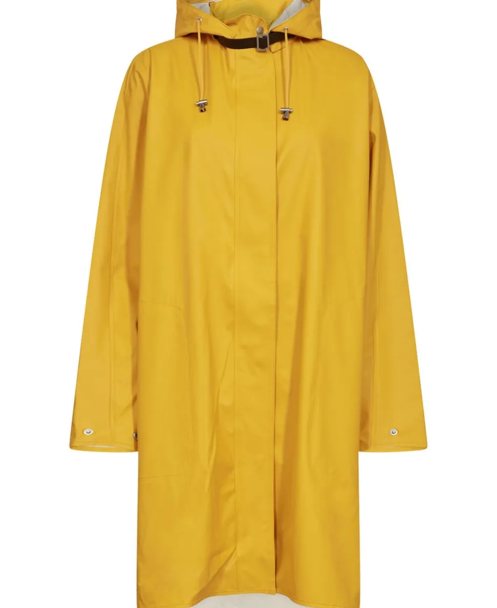 En feminin A-formet regnfrakke med Løs pasform under knæet. Regnfrakken har et diskret Ilse Jacobsen Hornbæk-logo præget på venstre ærme. Hætten er aftagelig og fastgjort med en vejrbestandig strop i kunstlæder. Stilen har sidelommer med flapper, smarte slidser i sidesømmene med trykknapper, knaplukning ved håndleddet og en 2-vejs YKK-lynlås midt foran. Indvendigt har stilen en ren og fin finish med et logobånd. Kvaliteten er en let og subtil vandtæt gummibelagt PU med polyester tricot på bagsiden, og alle sømme er dobbeltsvejsede. Stilen fås i et bredt udvalg af både klassiske og sæsonbestemte farver. Sammensætning: 100 % polyester trikot med PU-belægning. Funktionalitet: B/P 5000 mm