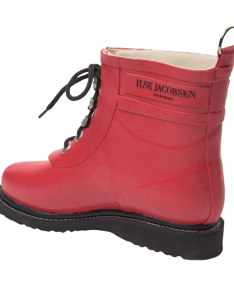 Short laced rubber boots by Ilse Jacobsen, featuring a decorative D-ring at center back and logo on the shaft. These wellingtons are made of sustainably harvested natural rubber and have been cut by hand. This material can withstand temperatures down to -20 degrees Celsius. The rubber composition is 80% pure, natural rubber and 20% secret formula. Entirely PVC-free, our boots contain no animal by-products. If not treated regularly, natural rubber will develop a white surface over the years. This is simply because the rubber loses its essential oil. To keep your boots in great condition for many years to come, we recommend that you treat them once a month with our oil. New laces are available in several colors.