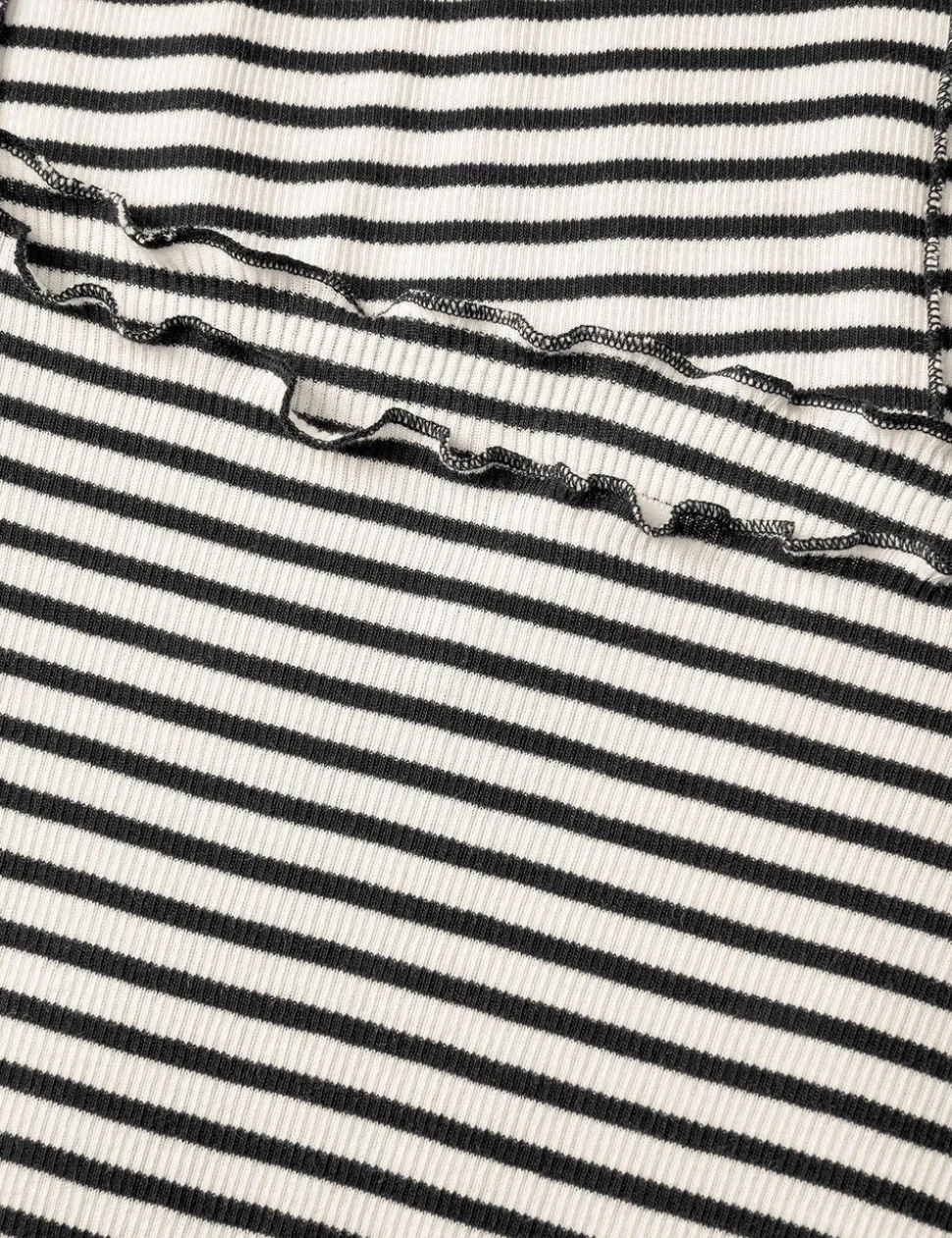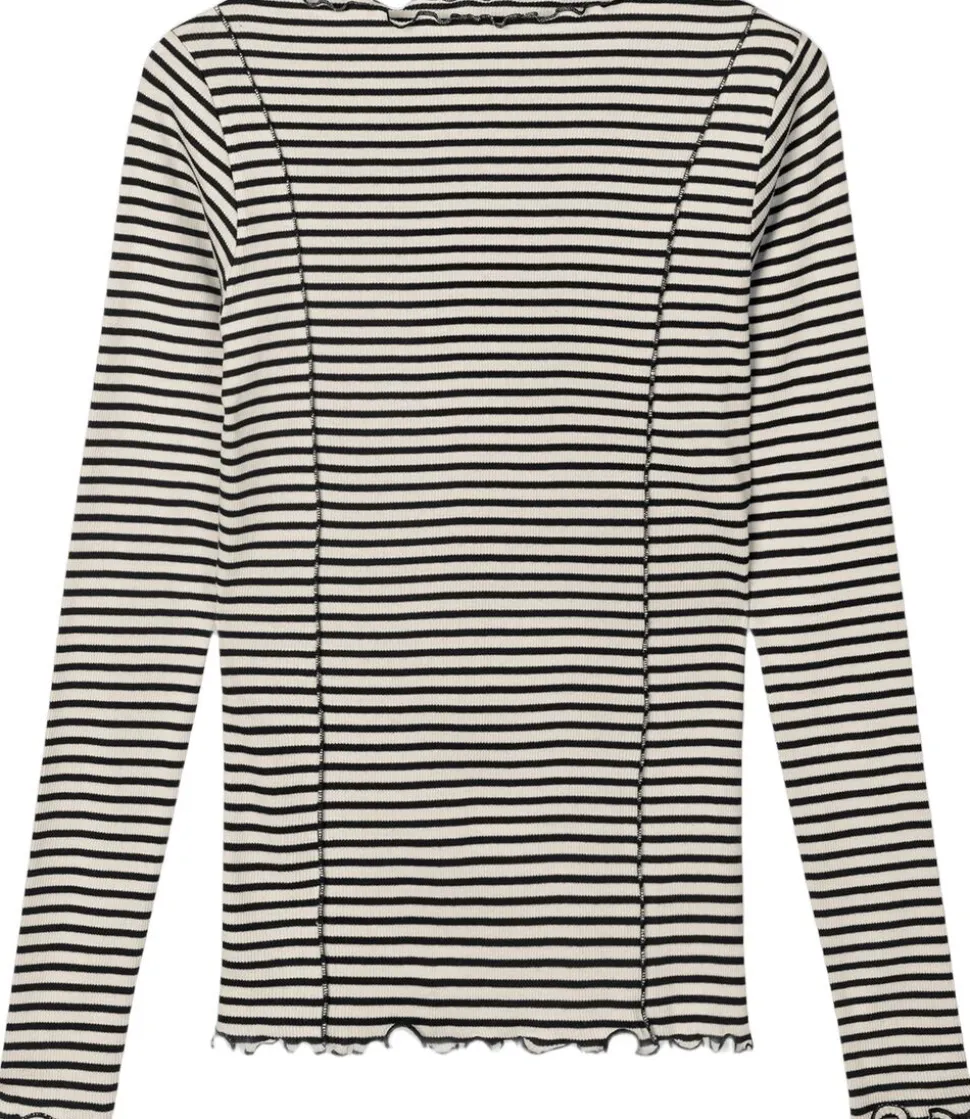 Tætsiddende og stretchy langærmet T-shirt med bådudskæring og krøllede kanter.