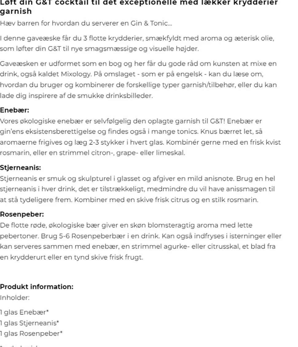 I denne gaveæske får du 3 flotte krydderier, smækfyldt med aroma og æterisk olie, som løfter din G&T til nye smagsmæssige og visuelle højder.