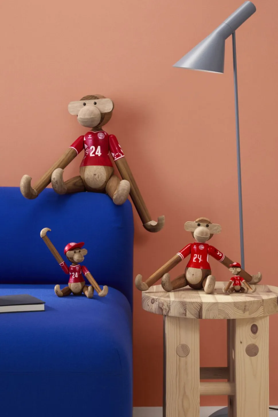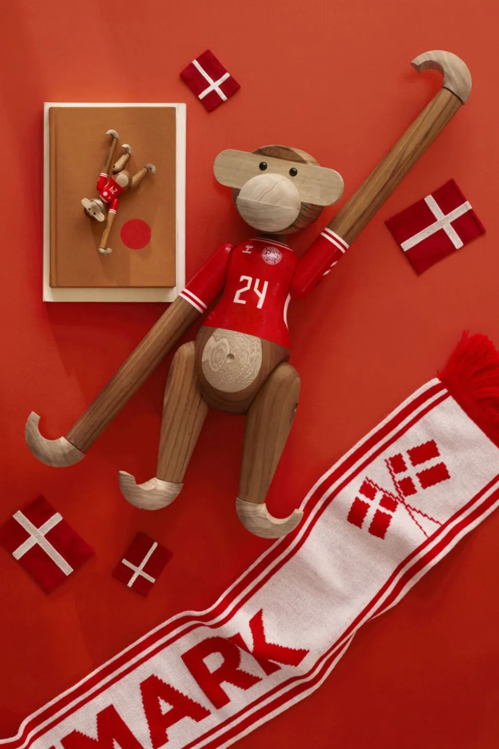 Ny holdkammerat til alle i rødt og hvidt. Med Kay Bojesen Abe x DBU er to af de største danske nationalikoner gået sammen for med humor, kreativitet og det gode håndværk at hylde sammenholdet og stoltheden over at stå sammen side om side fra leg til landshold. Og ligesom fodboldens verden byder på rækker og ligaer fra miniput til megastjerne, så kan du selvfølgelig også få Kay Bojesen Abe x DBU i den størrelse, der lige præcis passer ind i dit fanbarometer. Den mindste hedder Kay Bojesen Abe x DBU mini og udmærker sig med sine 9,5 cm i højden ved at være den mest bærbare minifan, som du kan have med dig overalt. Du bestemmer selv, om det skal være denne model med herrelandsholdets spillertrøje eller udgaven med kvindernes landsholdstrøje, som du inviterer indenfor eller måske dem begge. Du kan nemlig få Kay Bojesen Abe x DBU i to unikke varianter iklædt enten herrelandsholdets eller kvindelandsholdets flotte påmalede hjemmebanetrøjer, der begge er fortolket i tråd med figurhistorien og Kay Bojesens DNA helt ned til den mindste detalje, så de to trøjedesigns står så tæt som muligt på originalen og alligevel med deres helt eget tvist. Alle størrelser og varianter kommer i det klassiske teak og kontrolleret limbatræ. Samarbejdet med DBU sætter Kay Bojesens originale fortællinger i træ i en ny kontekst og tilføjer ydmygt og med et glimt i øjet et funklende nyt kapitel til en i forvejen smilende og levende designarv.
