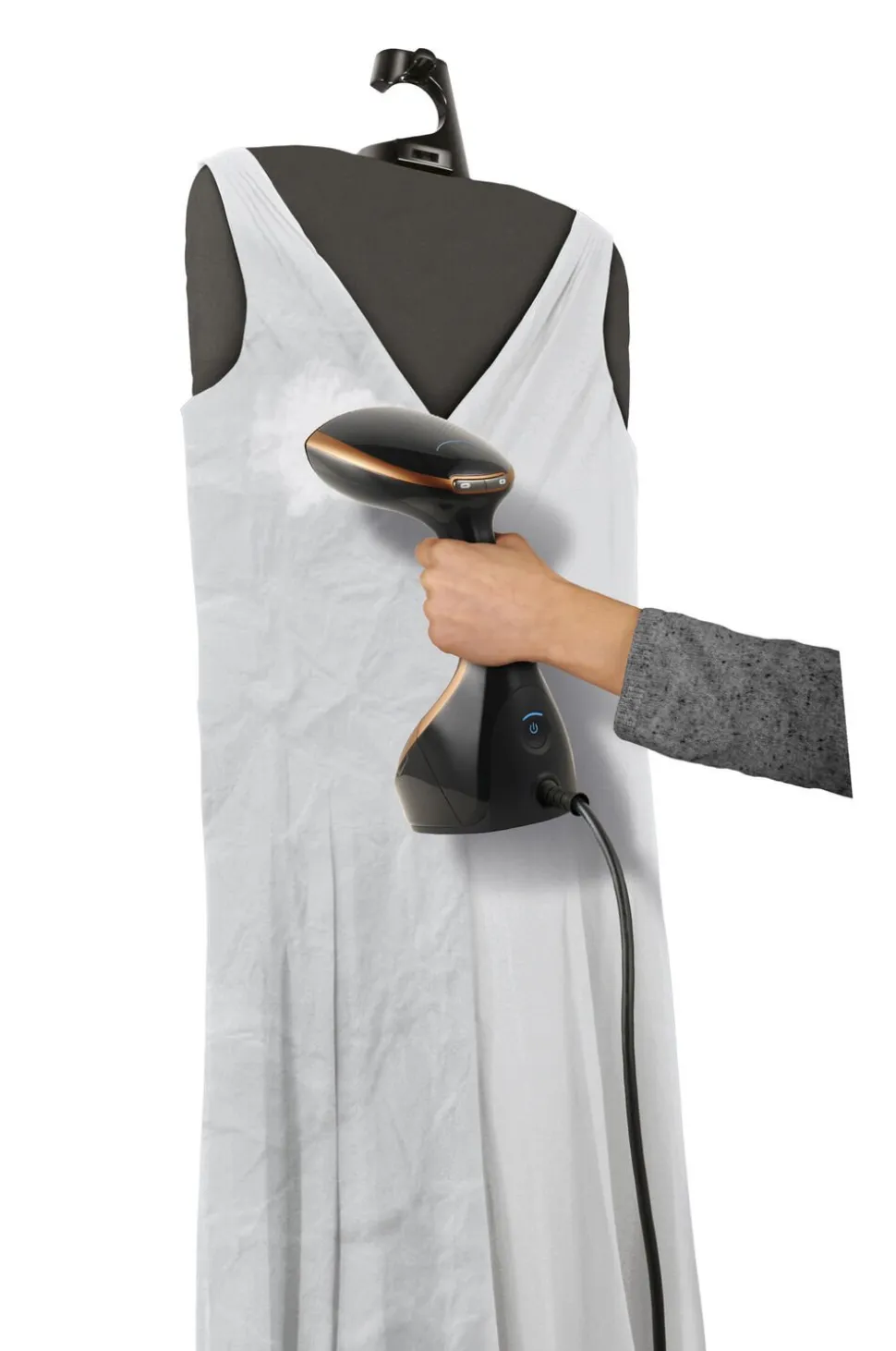 • Robust og holdbar: Lavet af sort plast, er denne dampbørste både robust og holdbar. Den kommer også med et rustfrit stål dørophæng, så du nemt kan hænge dit tøj op, mens du damper det.