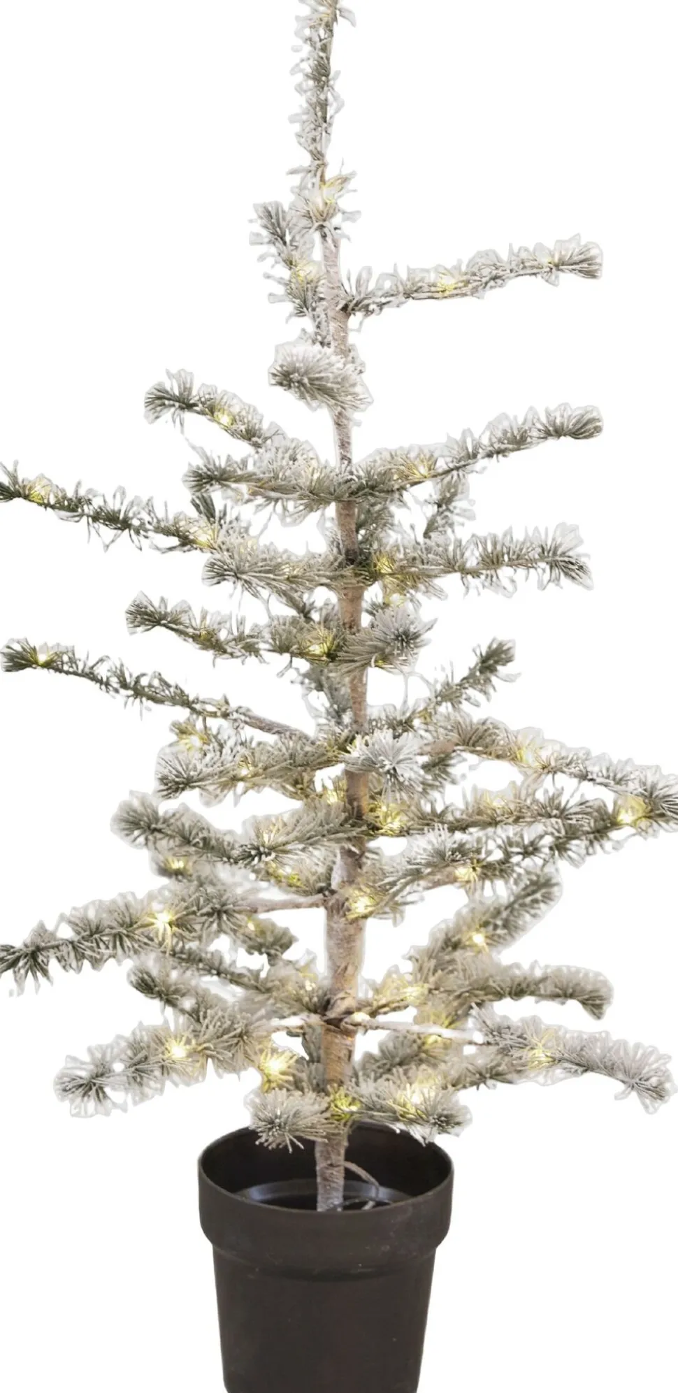 Klassisk cedertræ med et frostet look. Der er monteret lys på træet, som lyser med et varmt hvidt LED lys.