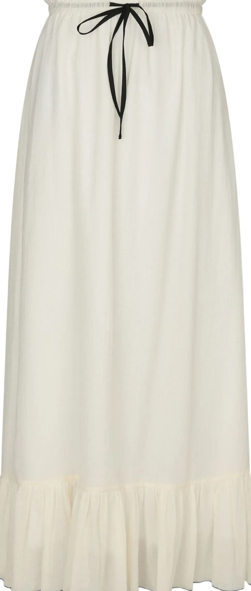 Maxi nederdel med sløjfe foran. Nederdelen har elastik og et justerbart bindebånd i taljen, kontrastbånd ved kanterne og flæser i taljen og bunden. Materialet er en let crepekvalitet. Den har en almindelig pasform og er lavet i en bomuldsblanding. Modellen er iført størrelse 36.