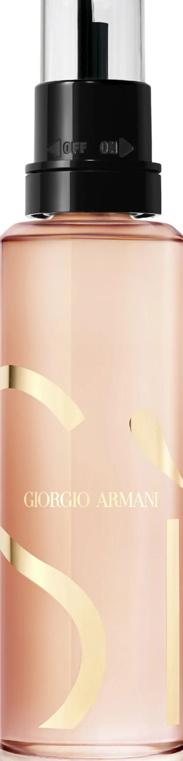 Den nye genanvendelige SÌ eau de parfum intense-flakon prydes af det gyldne SÌ-logo, der er præget i glasset.