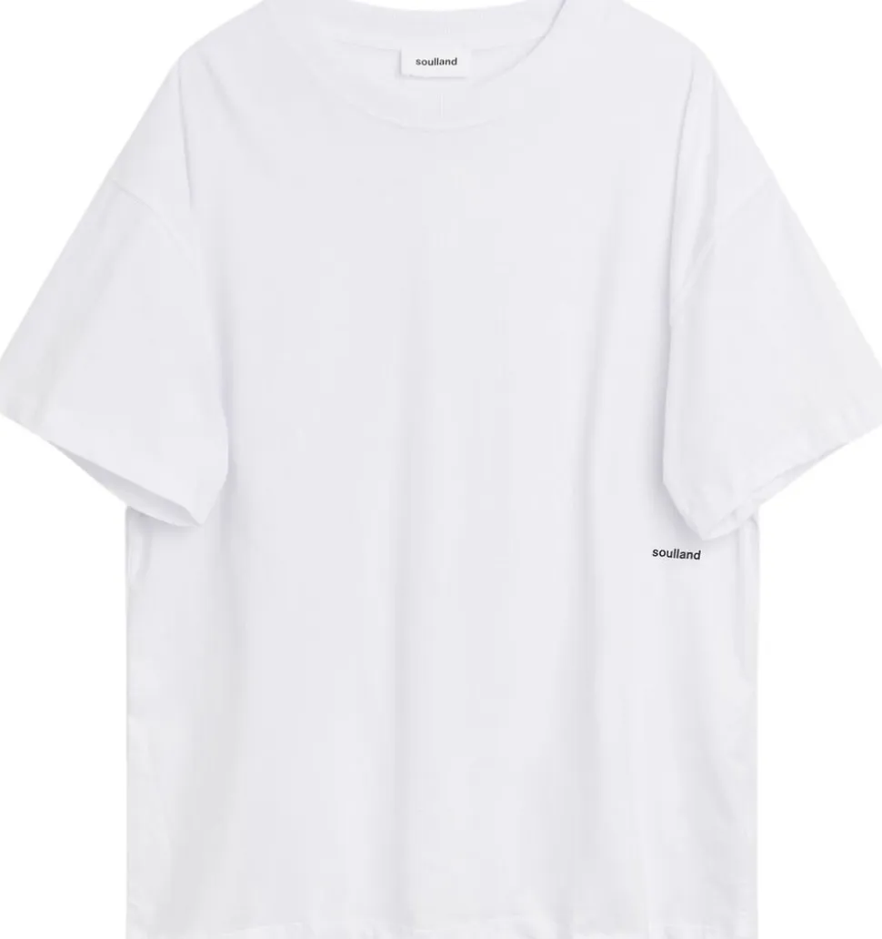 Ash er en almindelig t-shirt med 2×2 rib ved nakkeåbningen. Tøjet er en dobbeltnål, der er syet i armens hul, hals, bund og ærmekant. Der er et lille trykt Soulland-logo midt på Krop på venstre side. Den er lavet af 150 g/m2 jersey med en blød fornemmelse og er 100% bomuld (økologisk). Stoffet stammer fra Izmir, Tyrkiet, og tøjet er lavet i Izmir, Tyrkiet. Det vævede mærke er lavet af Oeko-Tex-certificeret polyester, og hængemærkerne er lavet af FSC-certificeret papir
