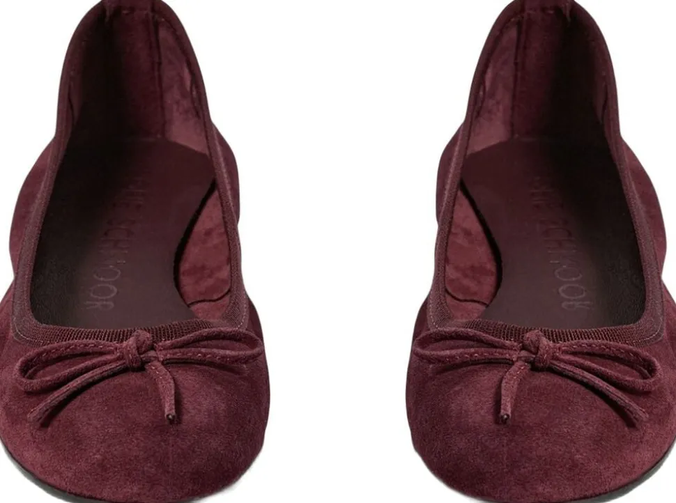 Sød ruskind ballerinasko med sløjfe over vristen. Skoen er designet i 100% læder med gummisål