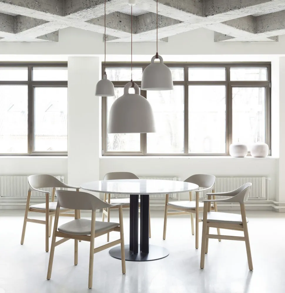Designerne Andreas Lund og Jacob Rudbeck har med Bell haft fokus på at designe en lampe, hvor ophængets design skulle have plads til at folde sig ud. Den bløde, runde silhuet og matte overflade giver indtrykket af, at lampen er støbt. Kontrasten mellem materialerne skaber en moderne lampe. Den lyse inderside reflekterer lyset, der falder som en kegle og giver en god lyskilde eksempelvis over spisebordet.