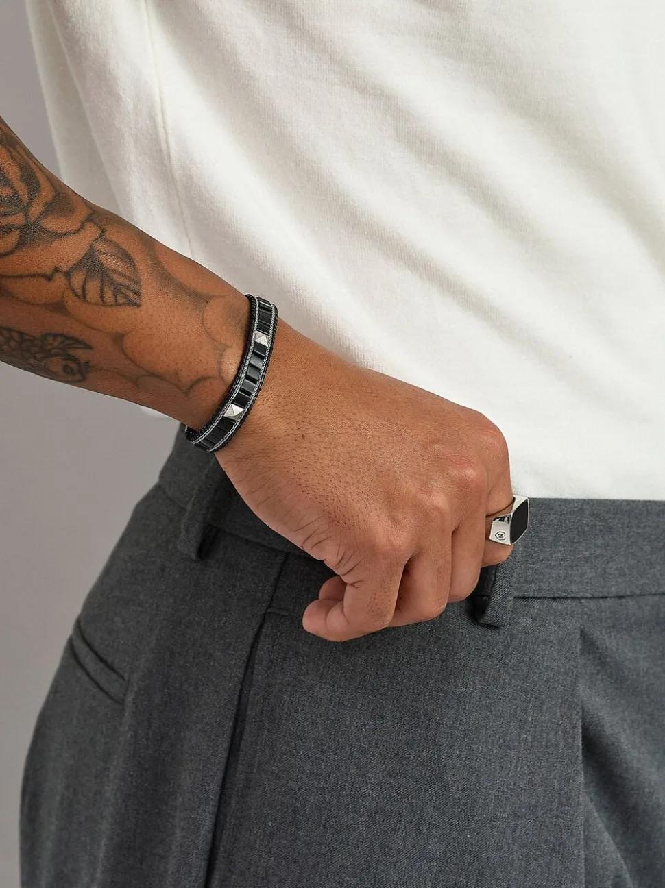 Herre Black Onyx Stud-armbånd med sølv, 10 mm armbåndsbredde, 6 mm matsorte Onyx-perler, børstet lås i rustfrit stål af høj kvalitet og stropper, vævet snor og kædedetaljer. Håndlavet i Los Angeles