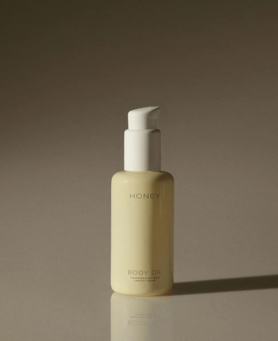 HONEY Body Oil er en nærende, styrkende og blødgørende kropsolie. Den er sammensat af seks økologiske og naturlige planteolier, der er udvalgt for deres effektivitet, blidhed og allergivenlighed: Styrkende hybenkerne og den rige rapskimolie kombineret med abrikoskerneolie, fugtbevarende sheasmør, antioxidantrig marulaolie samt silkeblød squalane.
