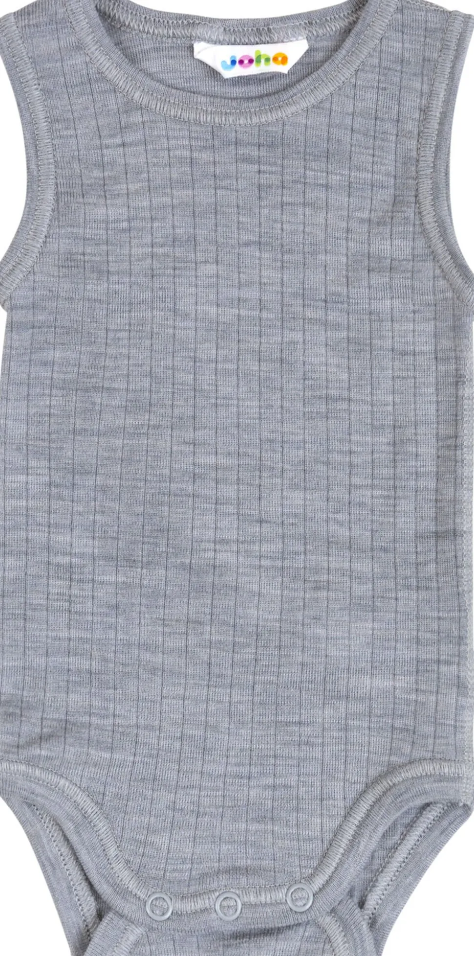 Boby uden ærmer. Trykknapper mellem benene. Blød, elastisk og let uldkvalitet med lodret rille mønster. Kvalitetens strækevne gør at den er behagelig at bruge inderst. Ensfarvet. Pure merino wool og Oeko-tex 100 mærket.