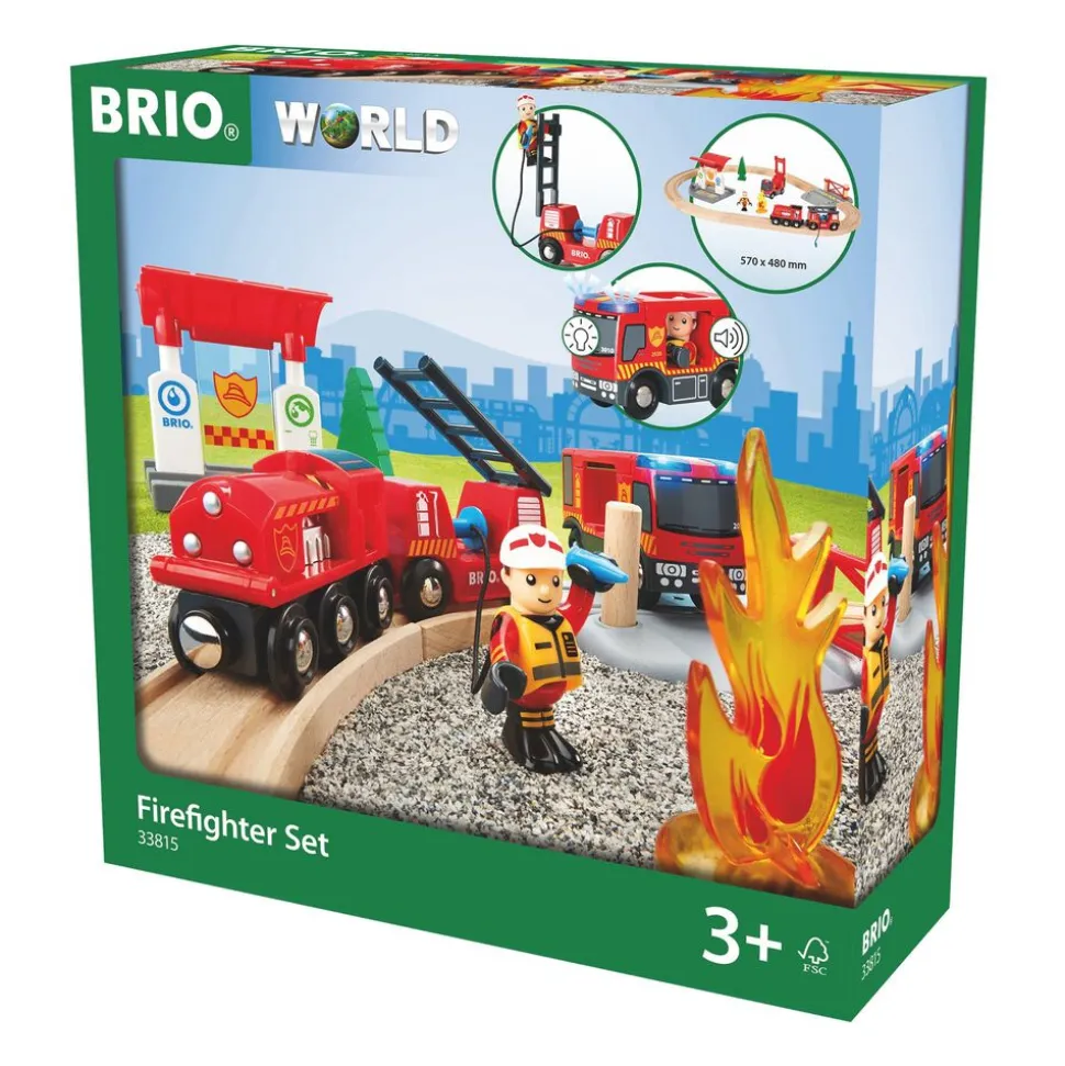 Det brænder. og de har brug for din hjælp! Kør straks til tankstationen og fyld brandtoget med vand og brændstof Brandmanden følger med i sin brandbil med sirener og lys Sluk ilden med brandslangen på vognen Sæt flere BRIO-skinner på for mere action I sættet indgår brandtogvogn med slange, en tankstation, en brandmand. en brandbil med lys og lyd, overkørsel med låge, grantræ, ild og skinner I alt 18 dele Fra 3 år