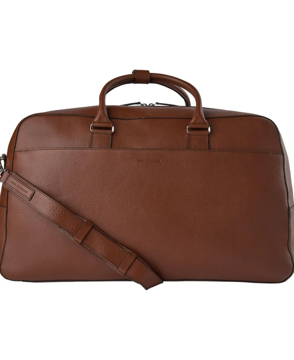 Weekend bag in soft grainy leather. Detachable shoulder strap, side handle and two-way zip at top. Zipped outside front pocket, trolley attachment strap at the back. Inside features one large zipped pocket and one open welt pocket. Embossed Tiger of Sweden logo at front. Size: 31.5 cm x 53 x 27 cm