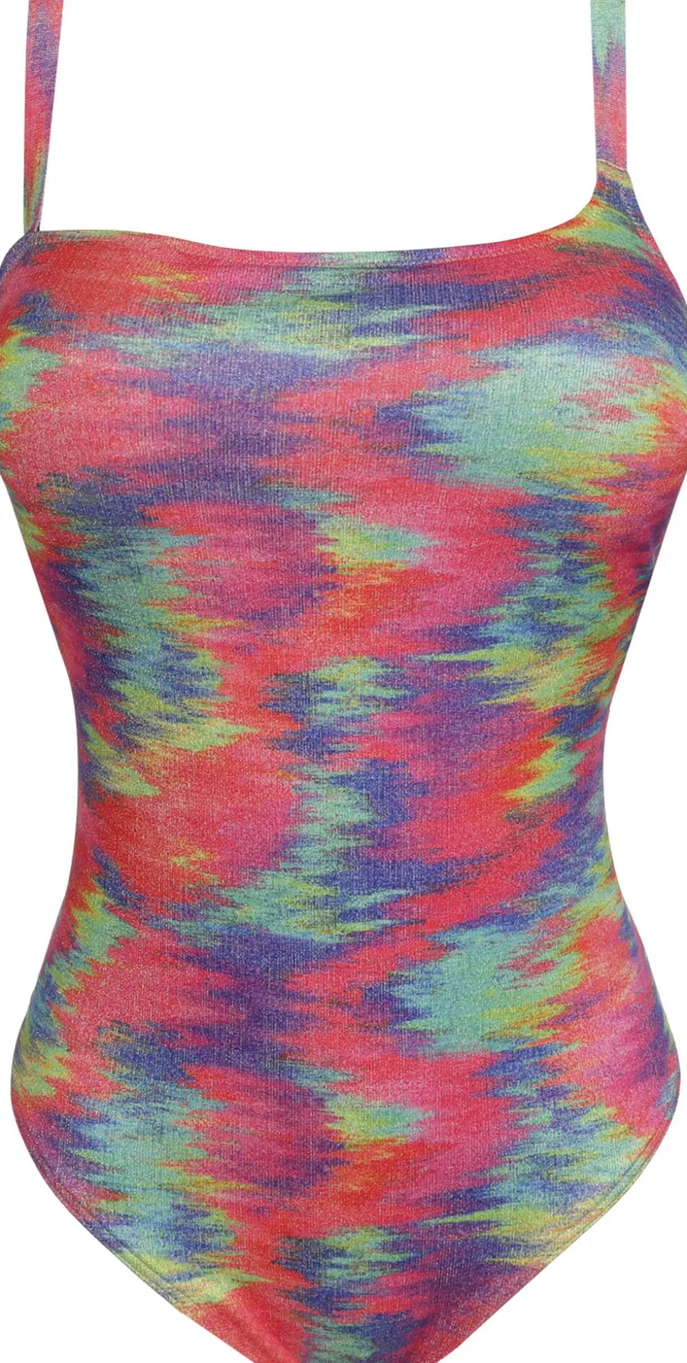 Stilfuld badedragt med højtskårne ben. Du kan bære den med en eller to stropper. Sexet og stilfuld! Skålene giver god støtte, og det høje snit får dine ben til at syne længere. Flerfarvet print med subtil glans.