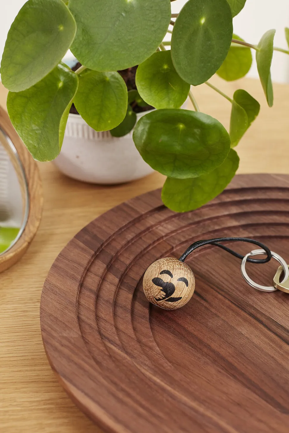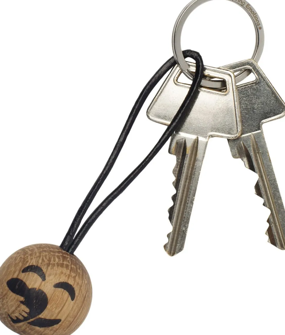 Care er en nøglering, der varmer om hjertet. Den minder dig om at drage omsorg for dig selv midt i din travle hverdag og så holder den styr på dine nøgler imens. Selve trækuglen er lavet i eg og bliver forbundet til ringen via en læderstrop.