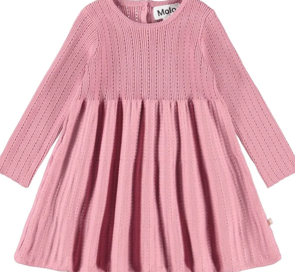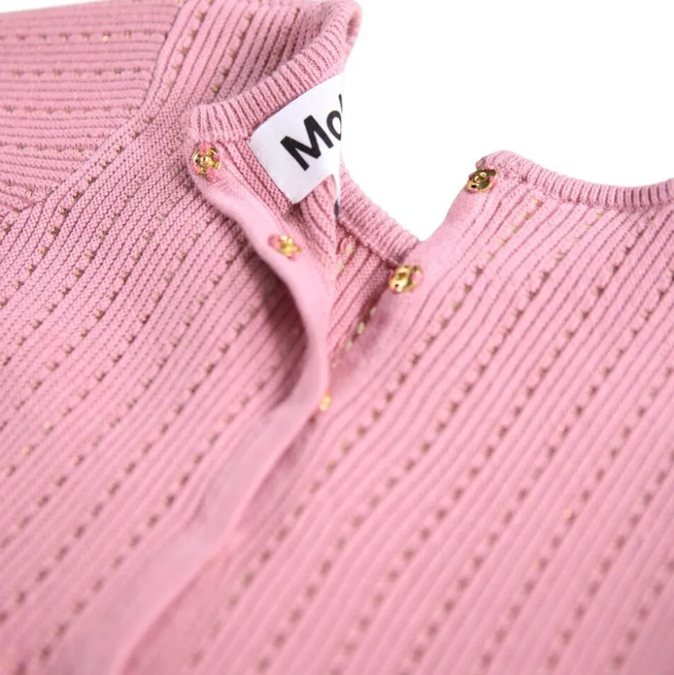Denne babykjole fra Molo er lavet i økologisk bomuld og strikket med en metallisk tråd. Skørtet har fin volumen og knapper ned langs ryggen.