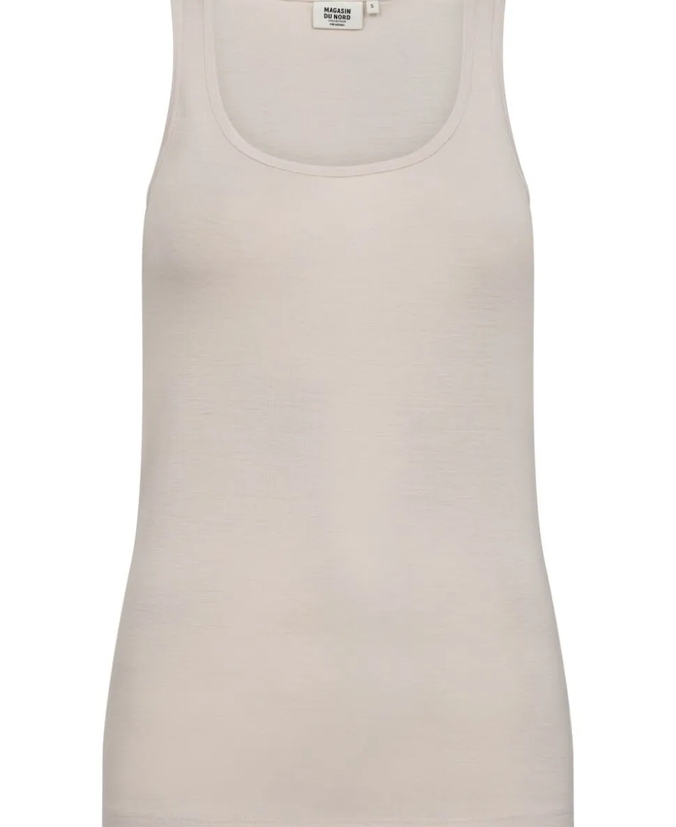 Top fra Magasin du Nord Collection i den blødeste kvalitet af 100% uld med RWS- og OEKO-TEX® STANDARD 100-certificering. Toppen er enkel i modellen med brede skulderstropper, en smal ribkant i den runde halsudskæring samt en komfortabel, tætsiddende pasform. En skøn top i den absolut lækreste kvalitet.