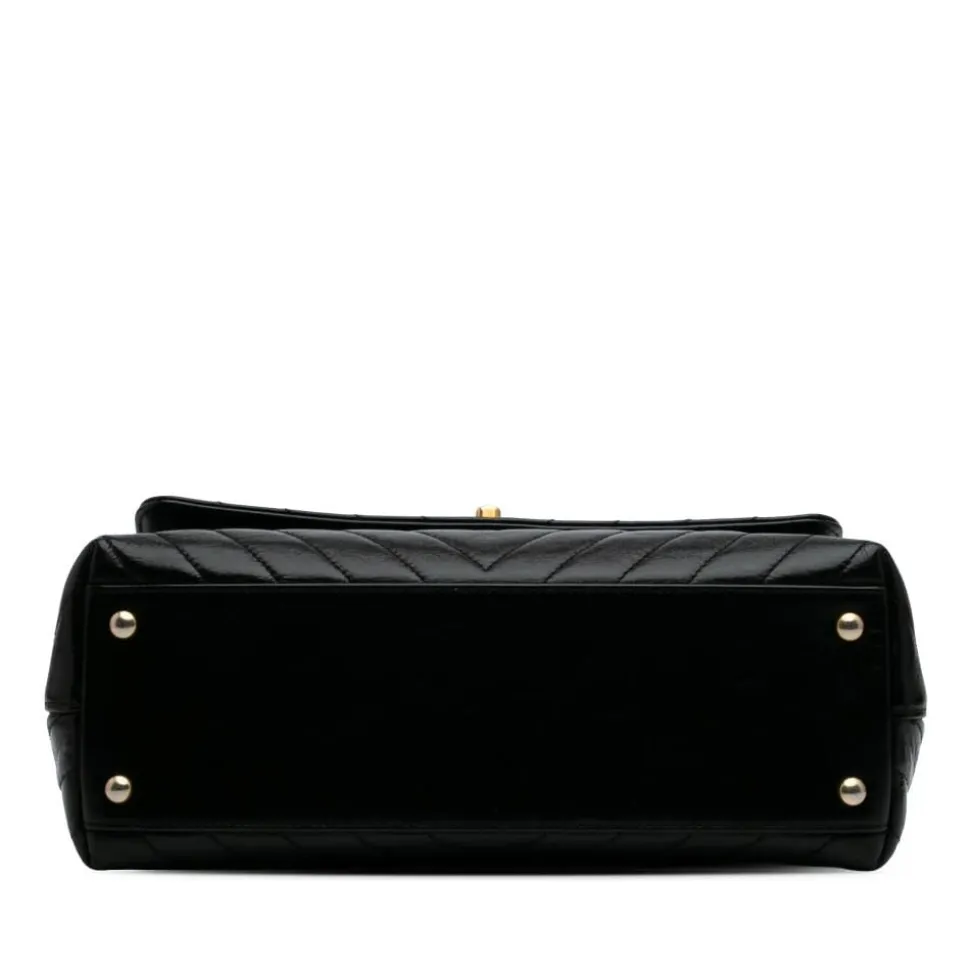 This satchel features a quilted leather body, a rolled leather top handle, a detachable leather-woven chain strap with a leather shoulder guard, a flap with interlocking Cs turn-lock closure, an exterior back slip pocket, an interior zip compartment, and interior zip and slip pockets. The bag has been repainted. It carries a B condition rating. Exterior bottom repainted. Lock scratched. Exterior front repainted. Exterior handle repainted. Interior lining repainted. Practical attachment damage, scratched. Zipper scratched.