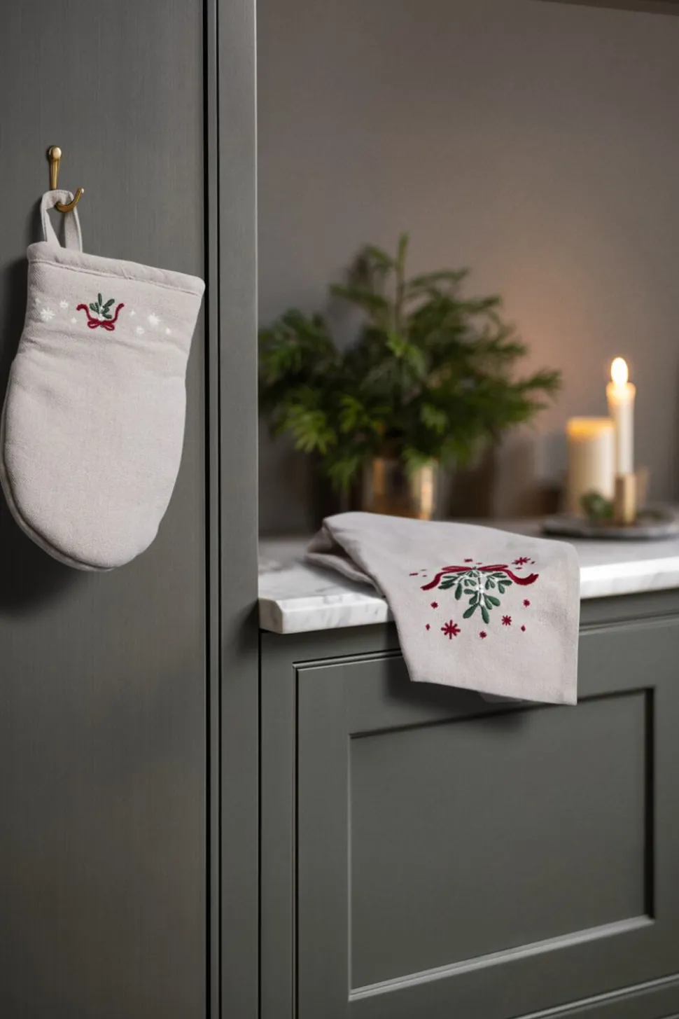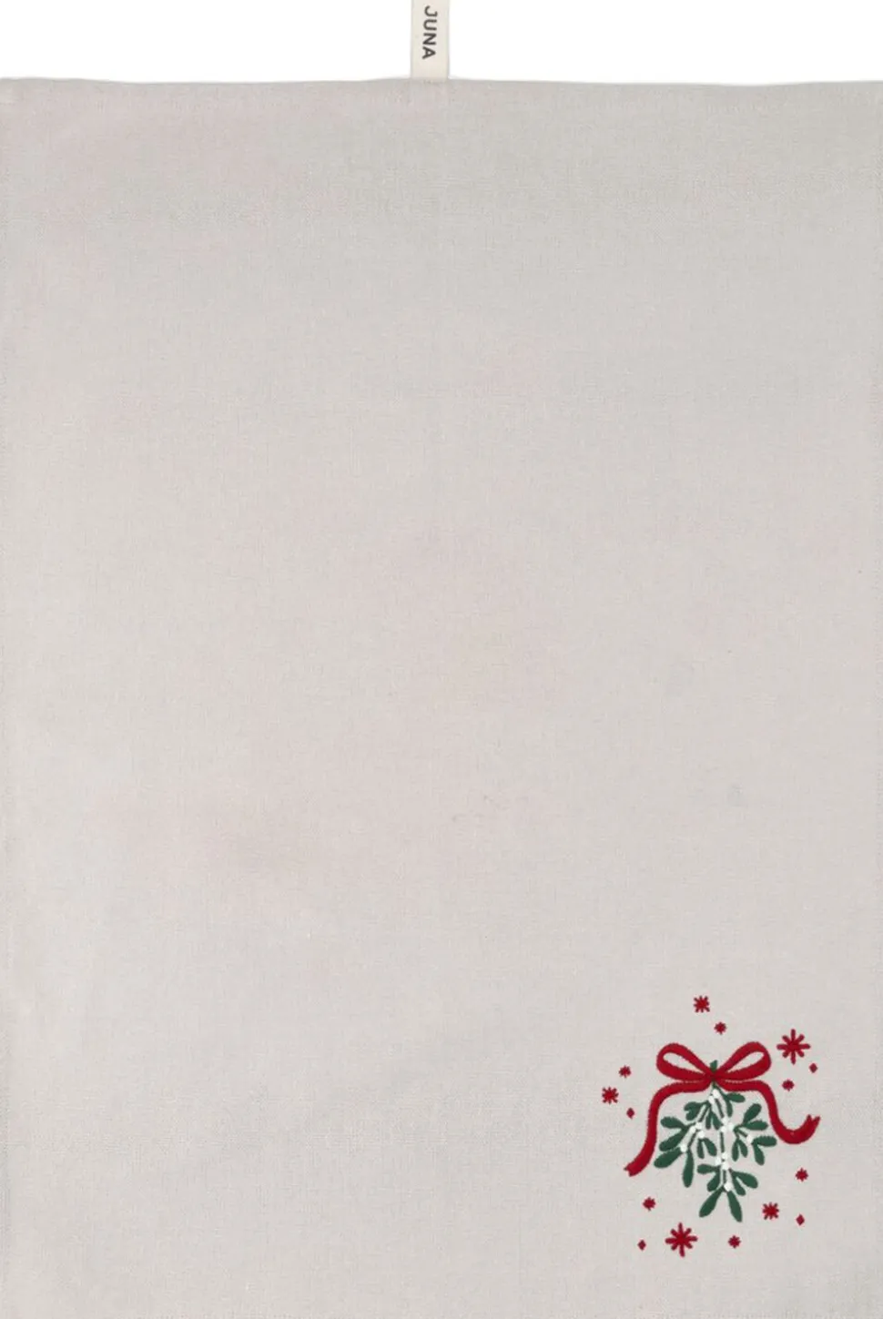 Mærk stemningen med JUNA Christmas Fable magiske juletekstiler til alle rum. Juleeventyr, fantasi og humoristiske dekorationer med masser af cosy kant. Med JUNA Christmas Fable får du en serie af moderne tekstiler med broderede motiver, der både æstetisk og legende forankrer og fornyer julens helt særlige stemning gennem et magisk juleunivers fuld af traditioner, hygge og personlighed. Tænk på en komplet og fuldstændig gennemført julekollektion af certificerede tekstiler til både dit køkken og resten af hjemmet. De dekorative julesokker på trappen fyldt op med dagens kalendergaver. Duftene fra køkkenet, der blander sig med hjertevarme forventninger og kærlige minder om en hyggelig aften i stuen. Den ikoniske juleborddækning, der løfter stemningen og får både børn og voksne til at glædes sammen. Og forestil dig så det hele tilsat nærmest karikerede klassiske broderier, der fortæller endnu flere historier end de tråde, de er syet med. Tryllebunden misteltensmagi, skitseagtige juletræer, nuttede rensdyr, ikoniske julehjerter og fluffy julestjerner. Alle skabt med masser af glimt i øjet i en sød og bevidst naivistisk stil, der ikke kan undgå at sende dit julehumør helt op til den skønneste stjernehimmel. JUNA Christmas Fable er skabt til at samle os omkring bordet, i køkkenet og også trække julestemningen med helt ind på puden, inden vi rammer drømmeland. Fuld af små broderede detaljer. Spækket med de helt store julefølelser. Dette fortryllende JUNA Christmas Fable-viskestykke i en klassisk sandfarve er dekoreret med et broderet motiv af seriens mistelten, der omgivet af de yndigste små julestjerner smukt og stilfuldt pryder viskestykkets nederste højre hjørne. Viskestykket måler 50×70 cm og kommer i et skønt tekstilmix, hvor GRS-certificeret genanvendt bomuld bliver spundet sammen med polyester for en flot og funktionel stofkvalitet med både blødhed og slidstyrke. JUNA Christmas Fable-serien giver dig et bredt udvalg af certificerede juletekstiler til hele hjemmet, hvor du mærker julestemningen i hver eneste tråd, og som du kan glæde dig til at finde frem jul efter jul. En kærlighedserklæring til godt håndværk og dekorativt dansk design vævet sammen af store eventyr og små broderede detaljer skabt til at holde længe og blive elsket endnu længere. (GRS Certified by Control Union, 1026087)